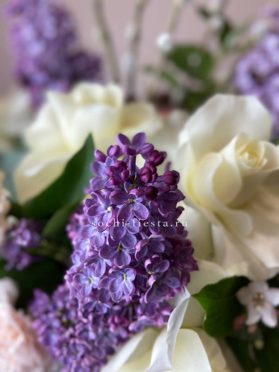 Белые розы образуют спокойную основу композиции, а ветви вербы добавляют вертикальный ритм. Сирень и диантусы заполняют пространство между крупными бутонами, создавая объёмную текстуру. Бокс удобно размещается на столе и сохраняет форму без дополнительного ухода.