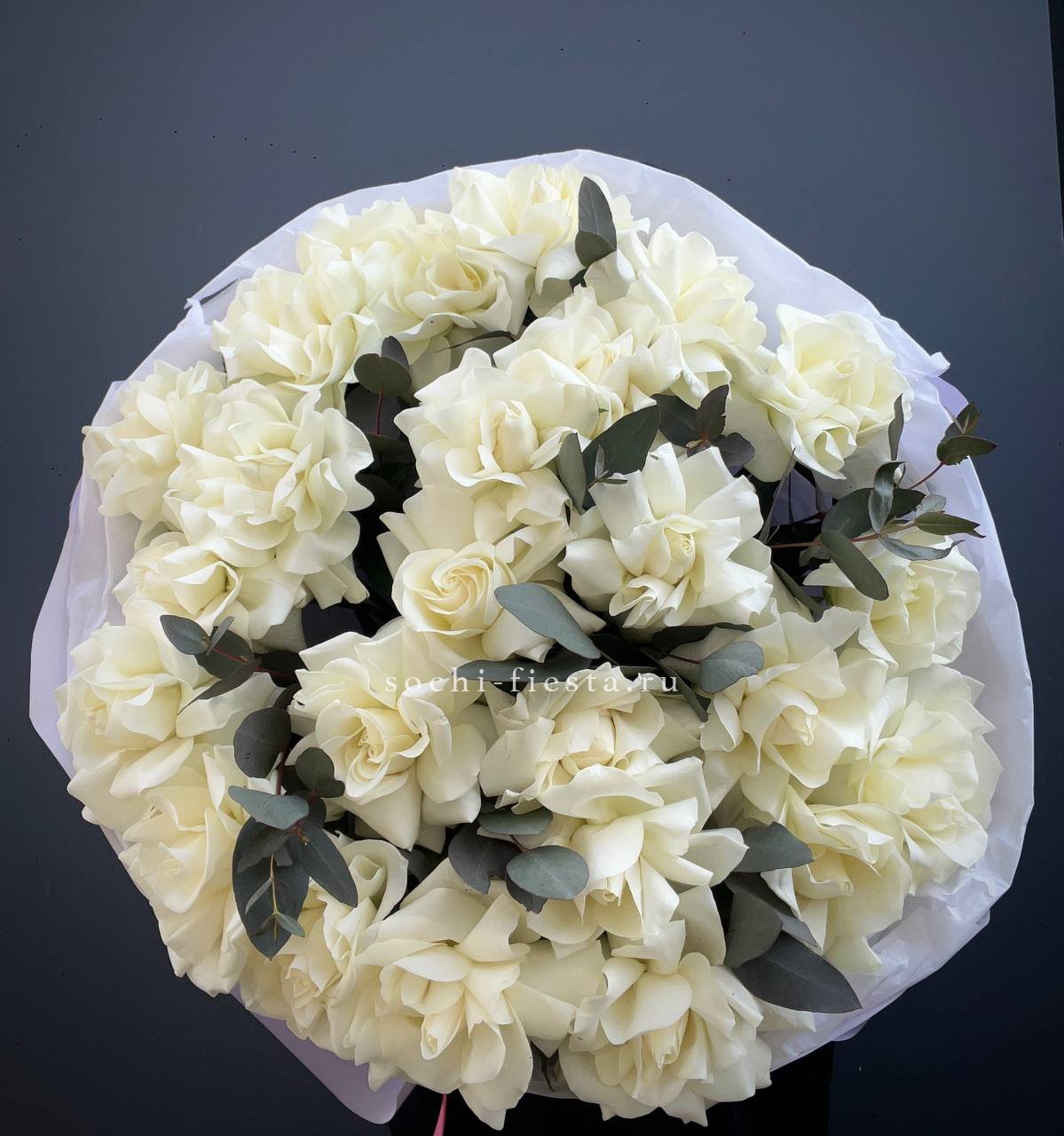 Семь пионовидных роз образуют компактный букет с мягкими линиями и спокойным ритмом. Ветви эвкалипта добавляют воздушности и завершают композицию.