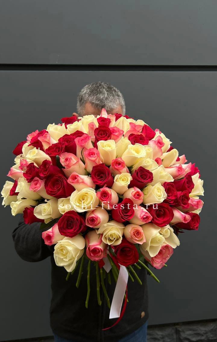 Розы Carousel радуют двухцветными лепестками с плавными переходами от кремового к малиновому краю. Пятнадцать бутонов собраны в аккуратную форму, которая долго сохраняет свежесть и яркость.
