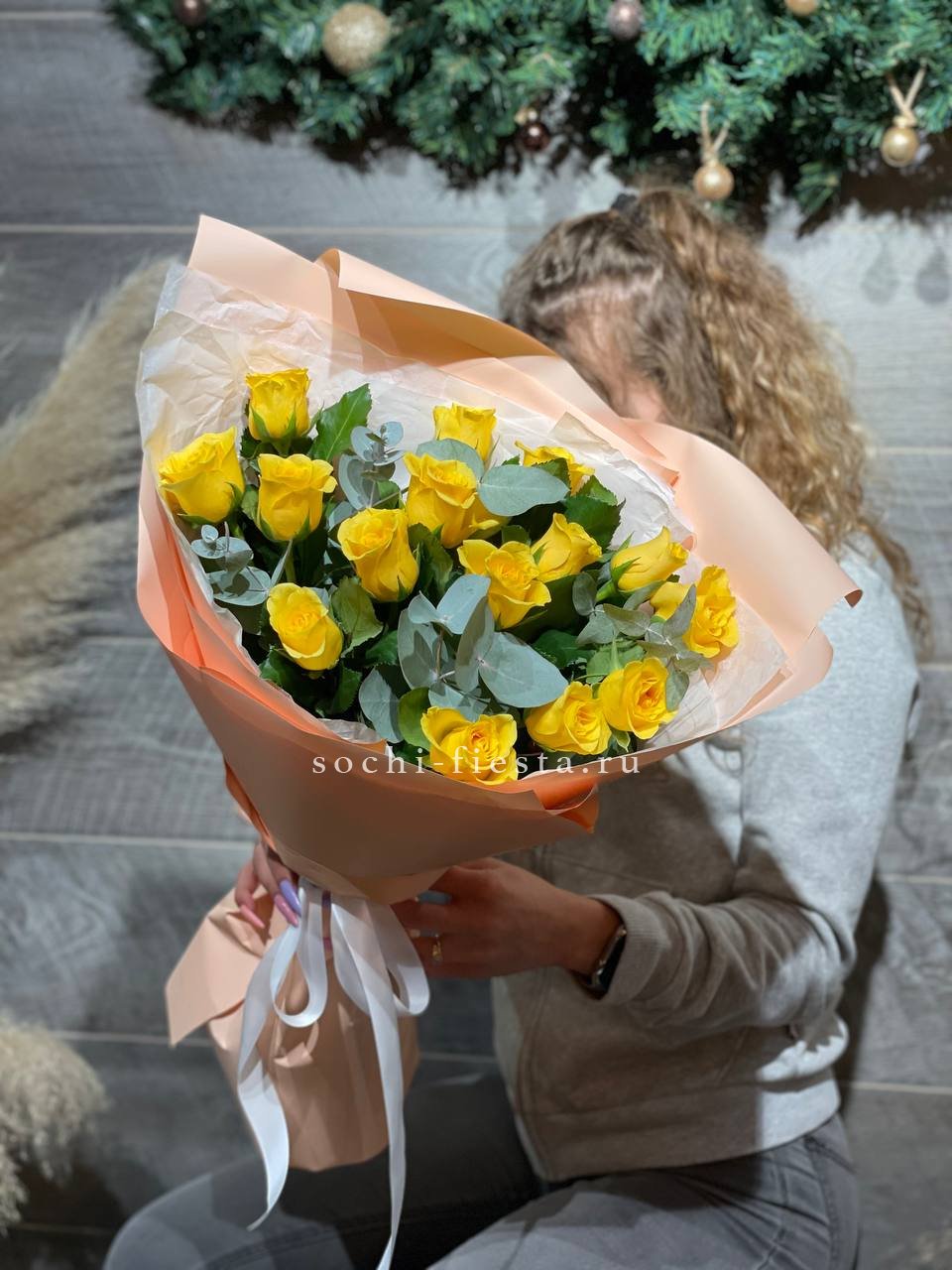 15 желтых роз, эвкалипт, лента, авторская упаковка.