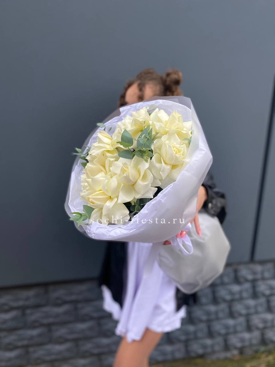 Пятнадцать белых роз в упаковке кофейного оттенка создают спокойное сочетание света и теплой глубины. Лаконичная форма букета удобна для вручения и дальнейшего размещения.