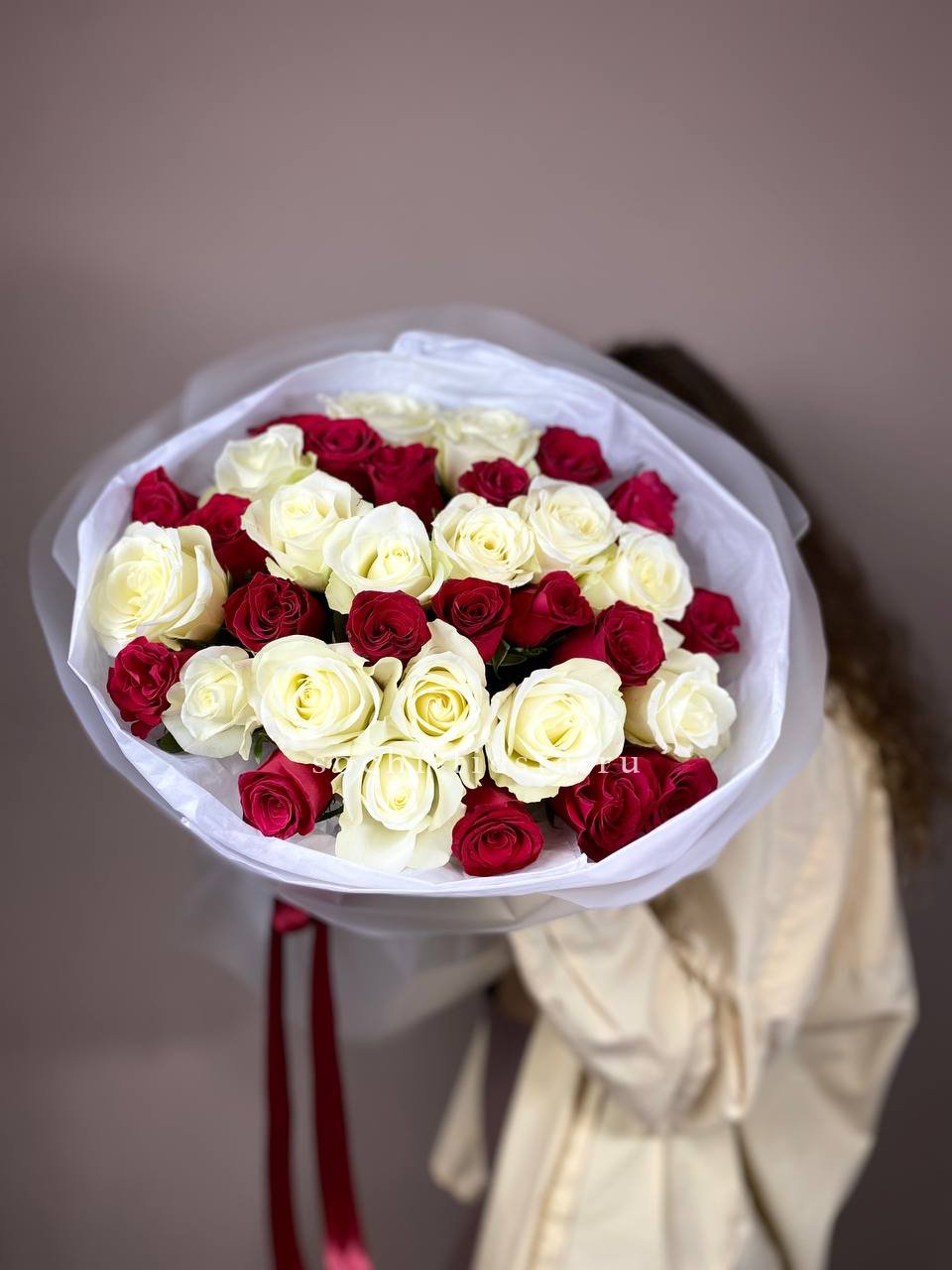 Белоснежные лепестки создают ощущение света и простора. Двадцать один бутон образует воздушную композицию с мягким переходом оттенков. Букет дарит момент тишины и покоя.