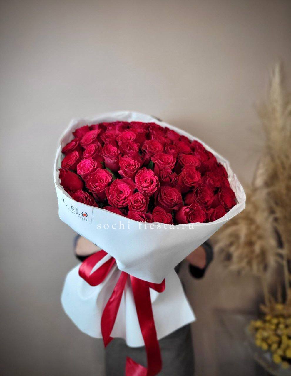 Red Naomi в графичной упаковке BLVCK — это игра между классическим красным и современной подачей. Плотные бутоны раскрываются медленно, сохраняя форму и насыщенность цвета.