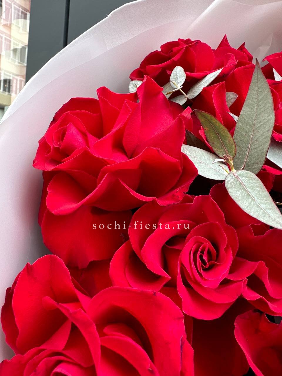 Французские розы с вывернутыми лепестками образуют пышную фактуру и глубину. Эвкалипт оттеняет насыщенность красного и придаёт букету свежесть.