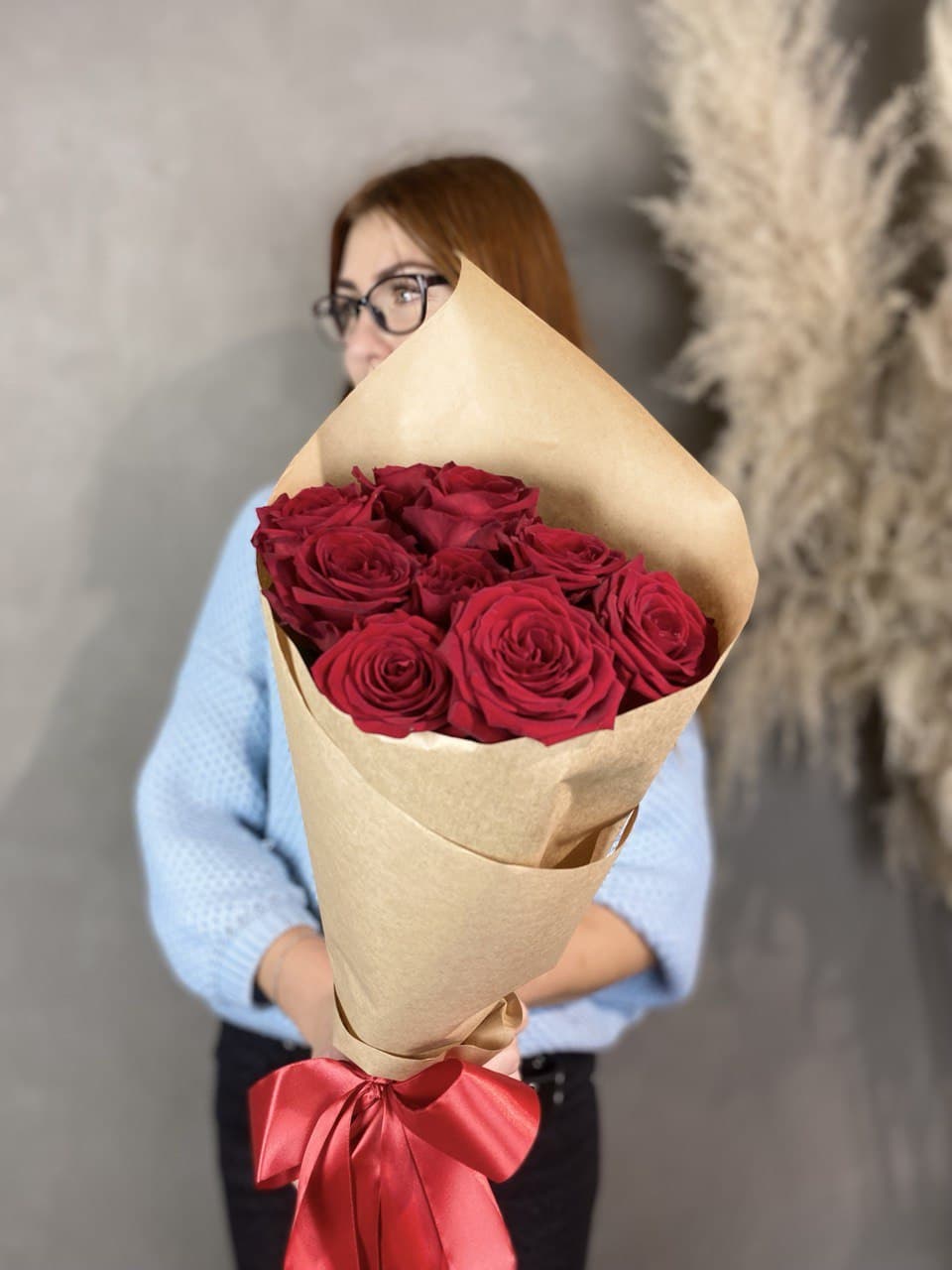 Девятнадцать роз с бархатными красными лепестками в лаконичной крафтовой упаковке. Естественная подача сохраняет свежесть линий и позволяет бутонам раскрыться в полную силу. Классика, которая работает всегда.