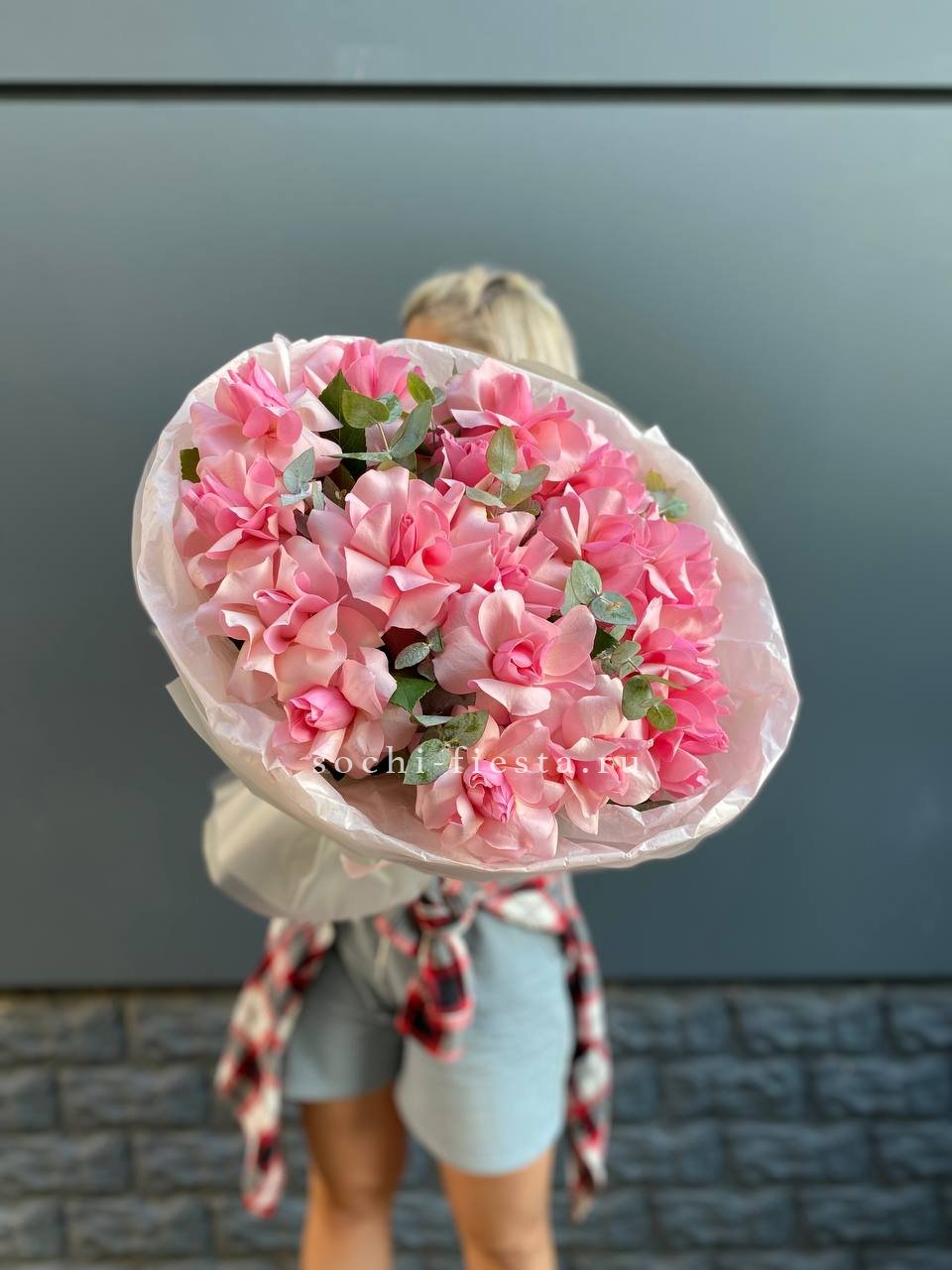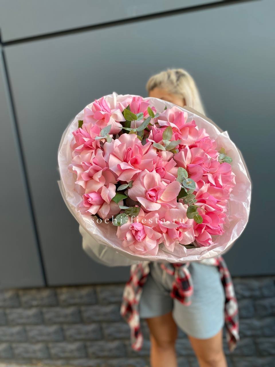 Розовые бутоны в обрамлении эвкалипта создают свежий летний образ. Тридцать три розы формируют объёмную композицию. Зелень добавляет воздушности и завершённости.