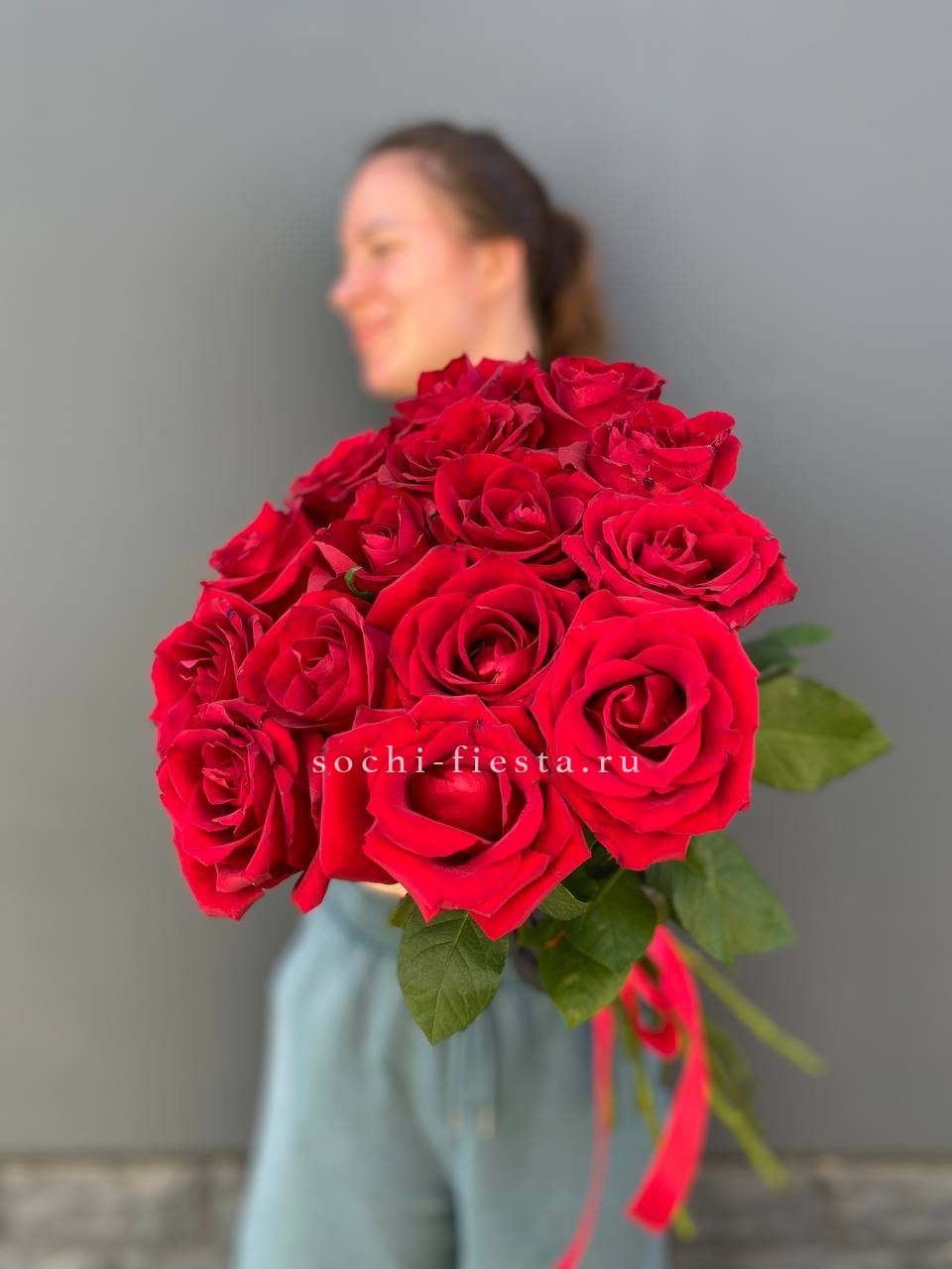 Пятнадцать красных роз на длинных стеблях выглядят графично и выразительно. Насыщенный оттенок лепестков держит внимание и создает яркий акцент.