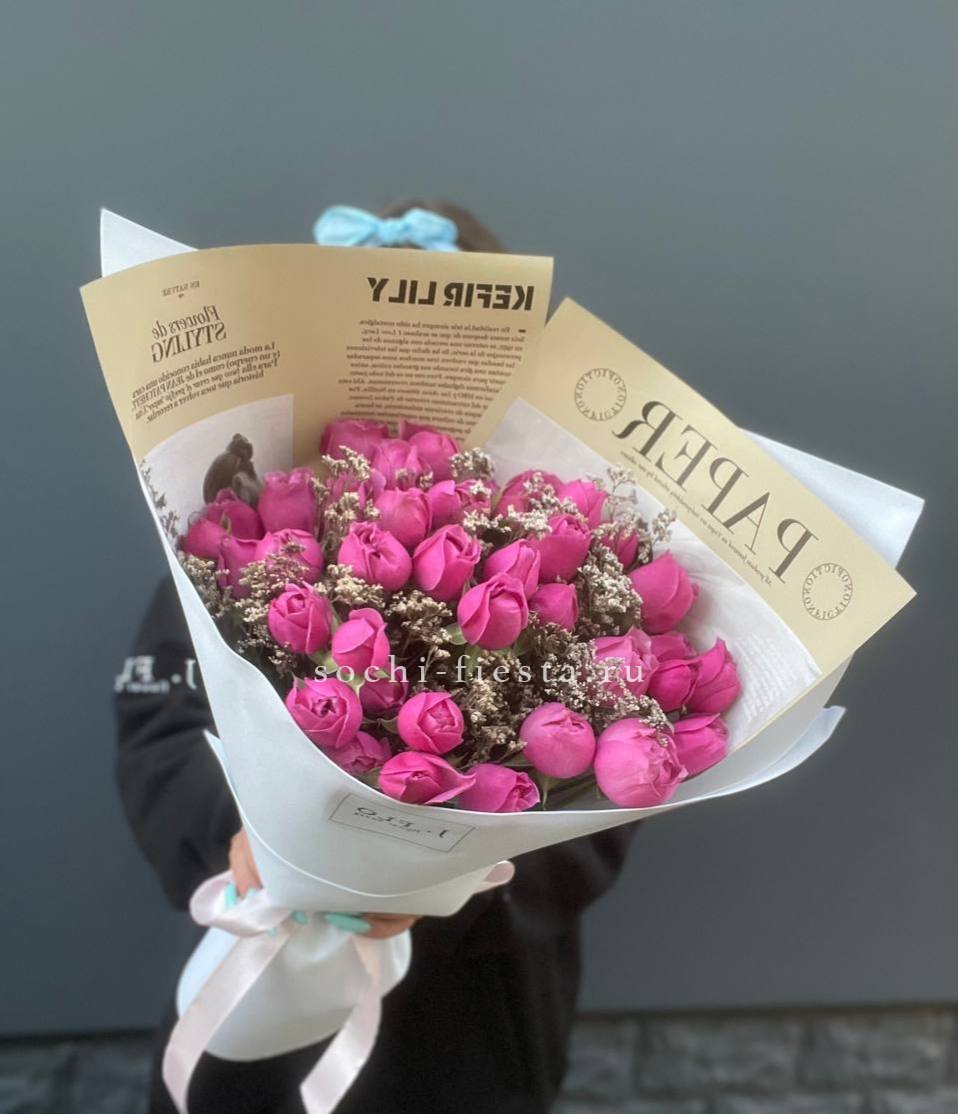 11 пионовидных роз мисти баблс, лимониум, лента, авторская упаковка.