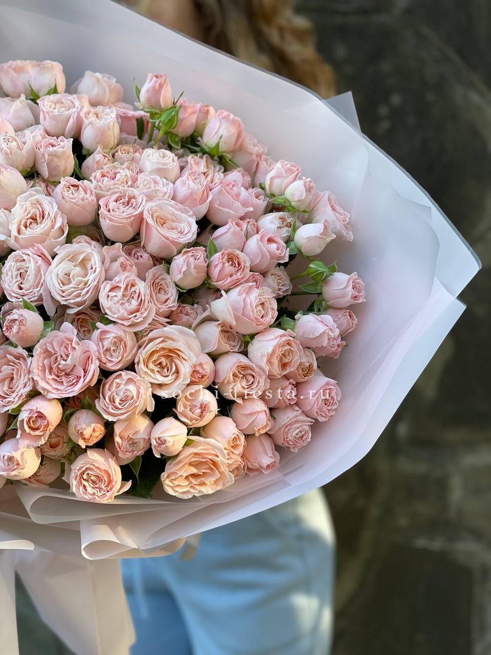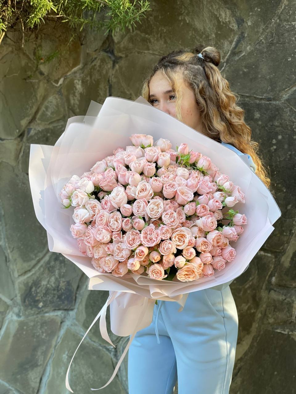 Спрей-розы раскрываются кустиками на гибких стеблях, образуя лёгкую живую структуру. Пятнадцать веток с множеством мелких бутонов придают букету естественную подвижность.