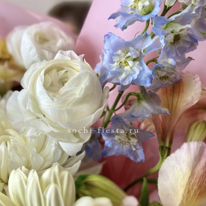 Состав сборных букетов в Оренбурге: розы (Freedom, Mondial), хризантема кустовая, альстромерия, эустома, фрезия. Дополнительно в сезон — тюльпаны, нарциссы, ранункулюсы, ирис. Поставки в Оренбурге раз в 3-5 дней из ближайшего регионального центра. Флорист планирует ассортимент под дату поставки и знает, что будет в наличии к нужному дню.