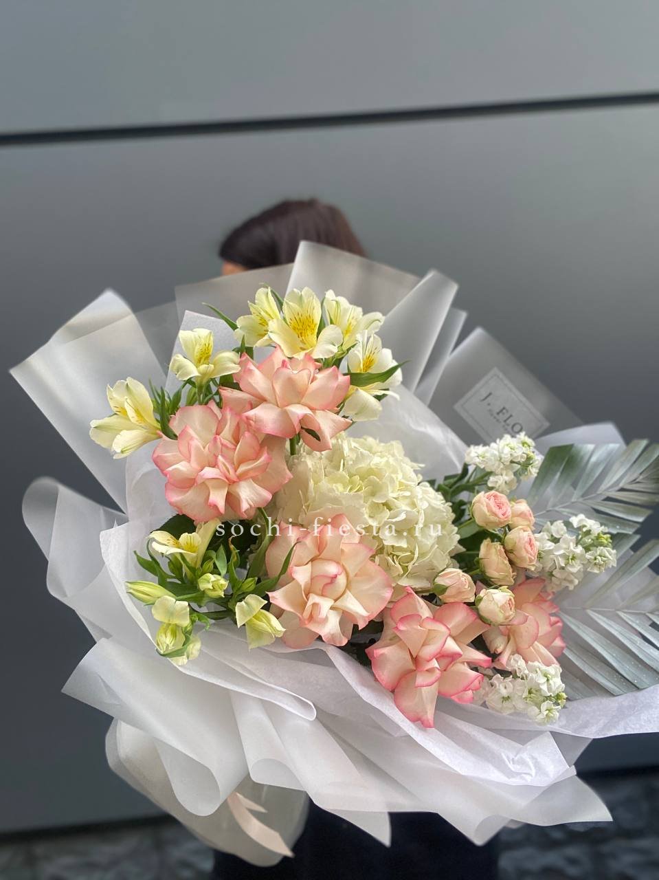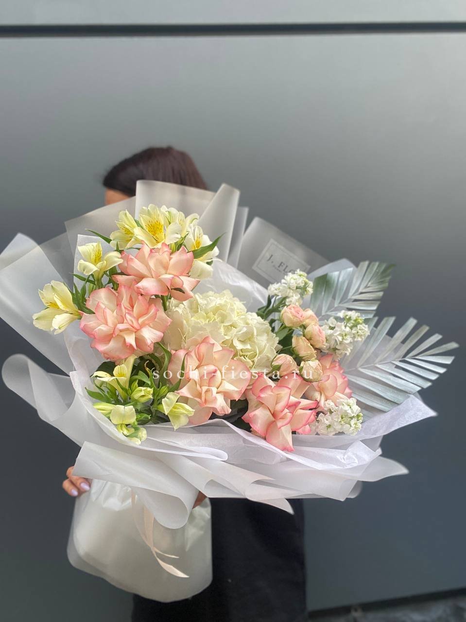 Воздушная композиция с пышной гортензией и розами Джумилия создает объемный силуэт. Маттиола и альстромерия добавляют легкости, а бомбастик вносит яркие акценты в общую структуру букета.