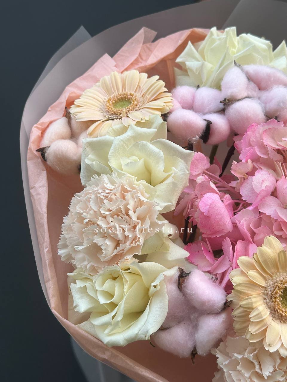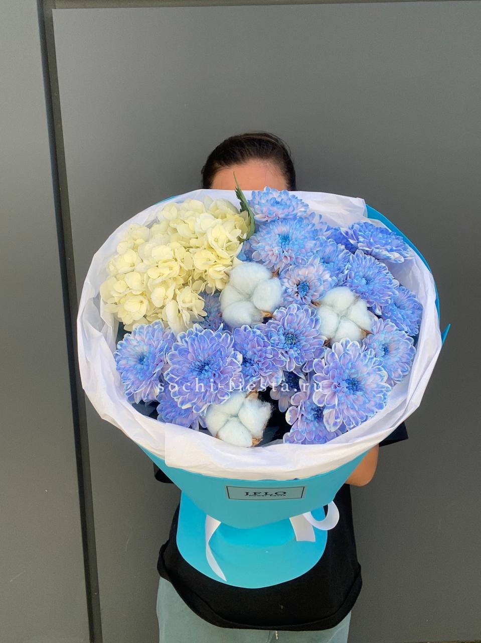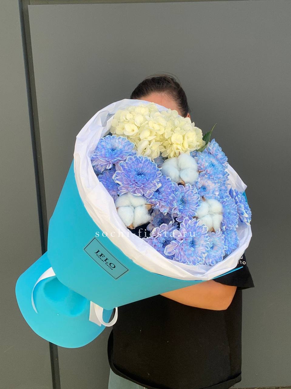 гортензия, розы джумилия, бомбастик, альстромерия, маттиола, чико, авторское оформление.