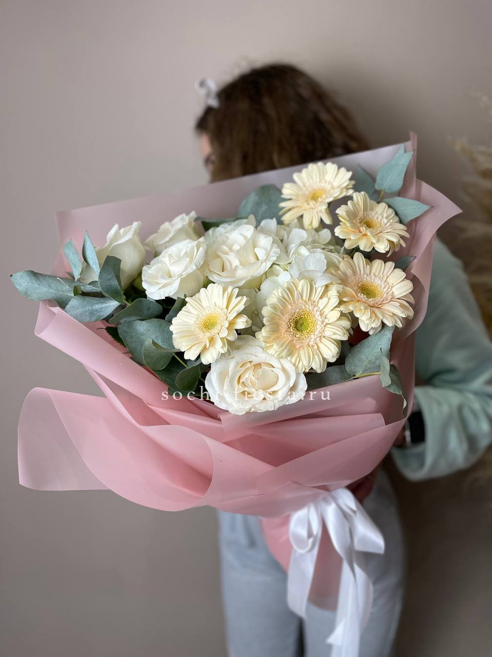 Пушистые шапки Мисти Бабблс переплетаются с классическими розовыми бутонами, создавая объёмный силуэт с мягкими переходами. Композиция собрана плотно, каждый цветок занимает своё место в общем ритме.