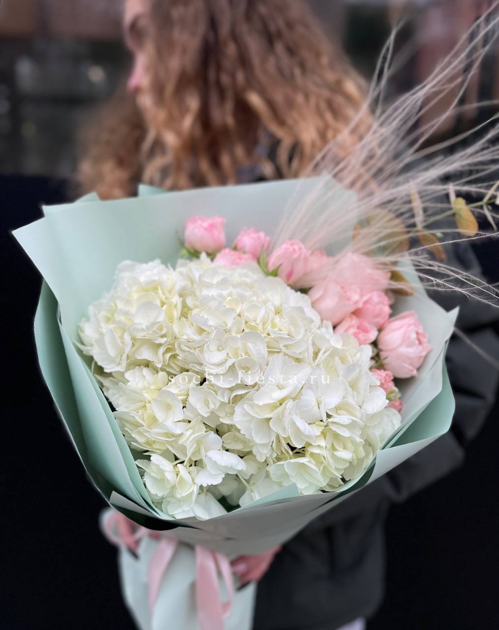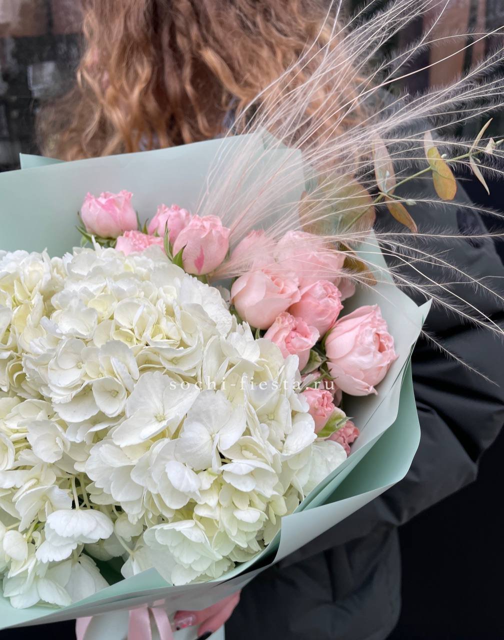 гортензия, розовые розы, диантусы, эустома, маттиолы, эвкалипт лента и дизайнерская пленка.