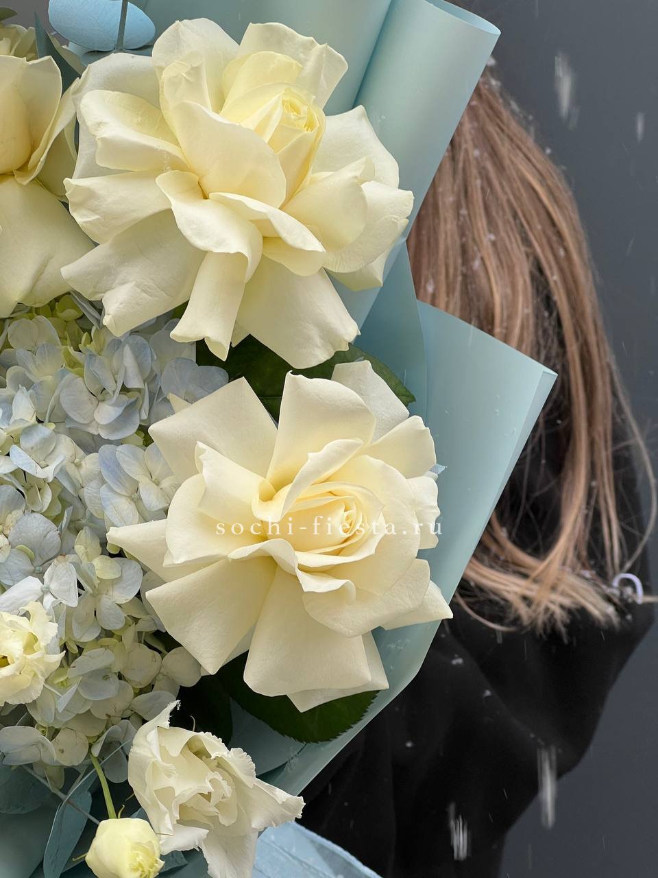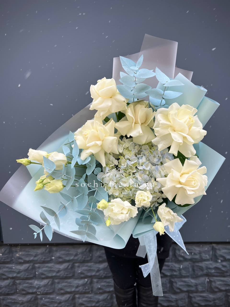 Пышная гортензия окружена розами и воздушными бутонами эустомы. Композиция собрана плотно, каждый цветок раскрывается в своём темпе, создавая объёмную текстуру.