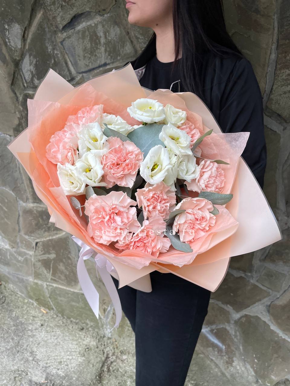 диантус, эустома, эвкалипт,  лента, дизайнерская пленка.