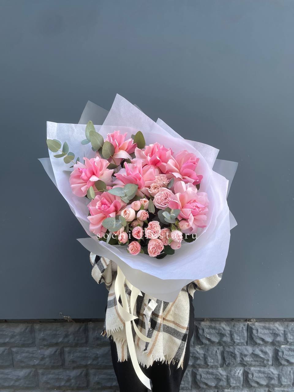 Розовые розы, пионовидная кустовая роза, эвкалипт,  лента, авторская упаковка.
