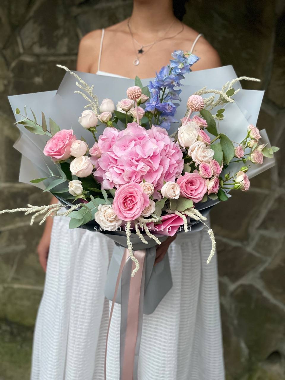 Плотные бутоны пионовидных роз соседствуют с классическими французскими сортами, создавая игру форм и текстур. Розовая палитра раскрывается через разную степень раскрытия лепестков, от плотных до воздушных.