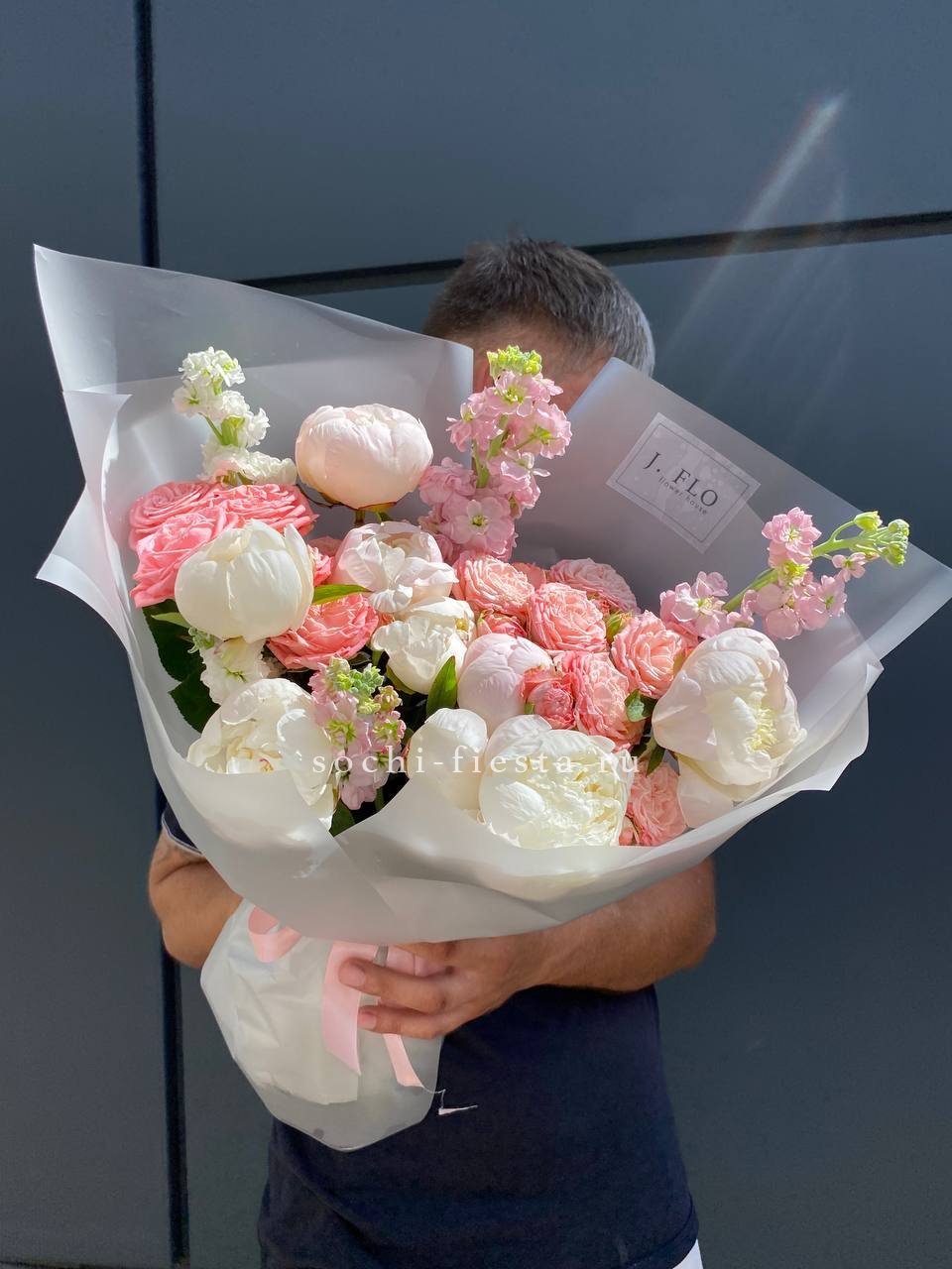 пионы, роза пионовидная, маттиола, лента, дизайнерская пленка.