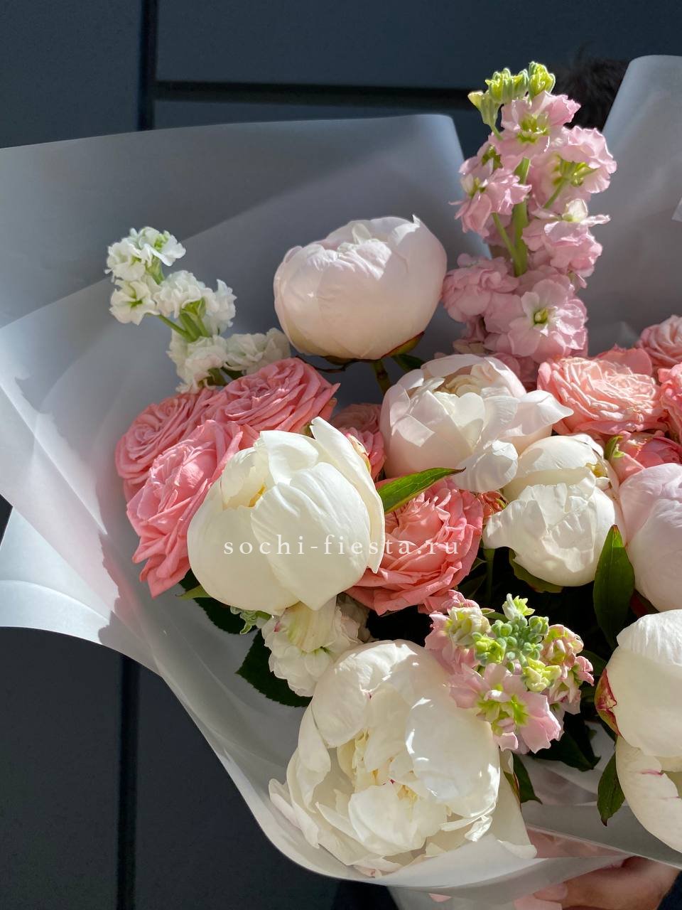 Пионы и пионовидные розы с их многослойными лепестками создают визуальную глубину, а маттиола добавляет вертикальные линии. Букет впечатляет плотностью и объемом раскрывшихся бутонов.