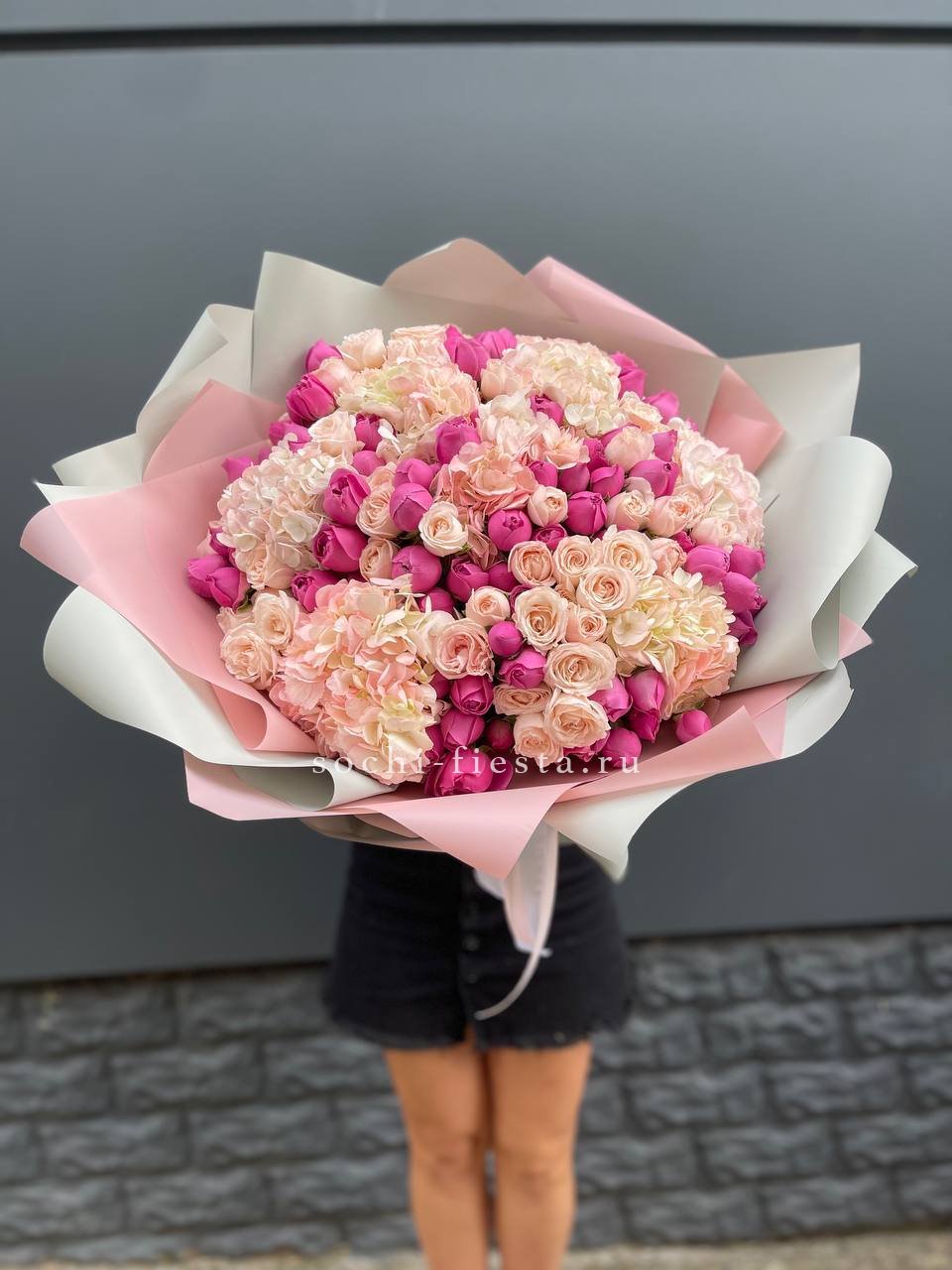 Пышные шапки гортензии задают объём, а россыпь кустовых роз создаёт живую текстуру по всей форме. Композиция наполнена воздухом и естественной лёгкостью.