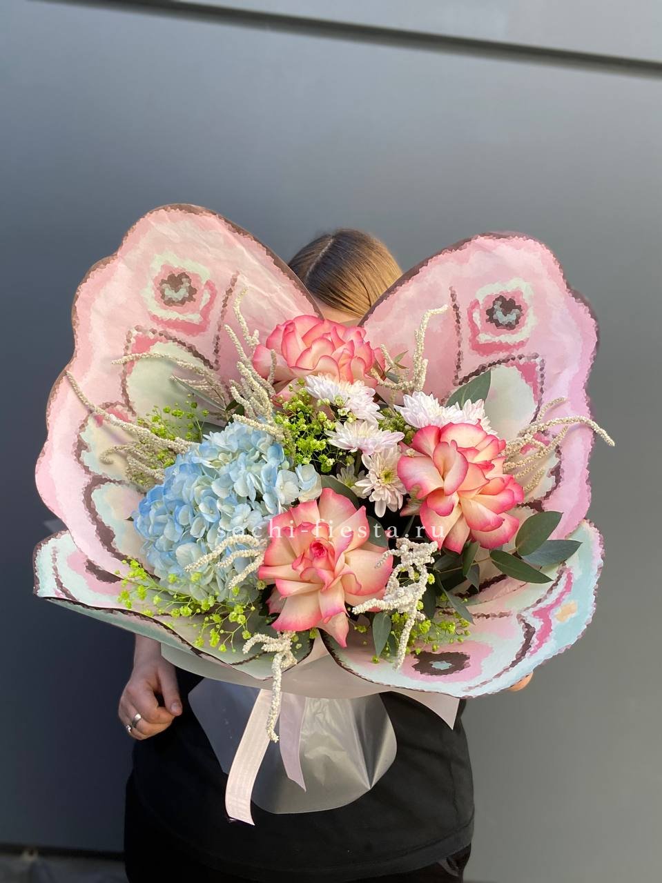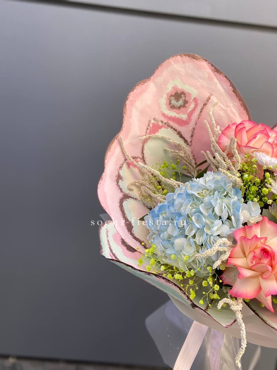 гортензия, хризантема, роза, эустома, упаковка, лента.
