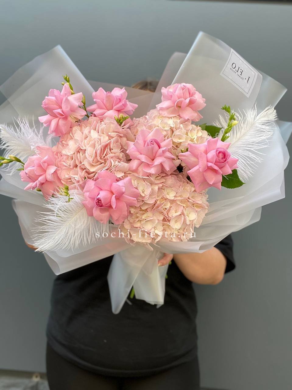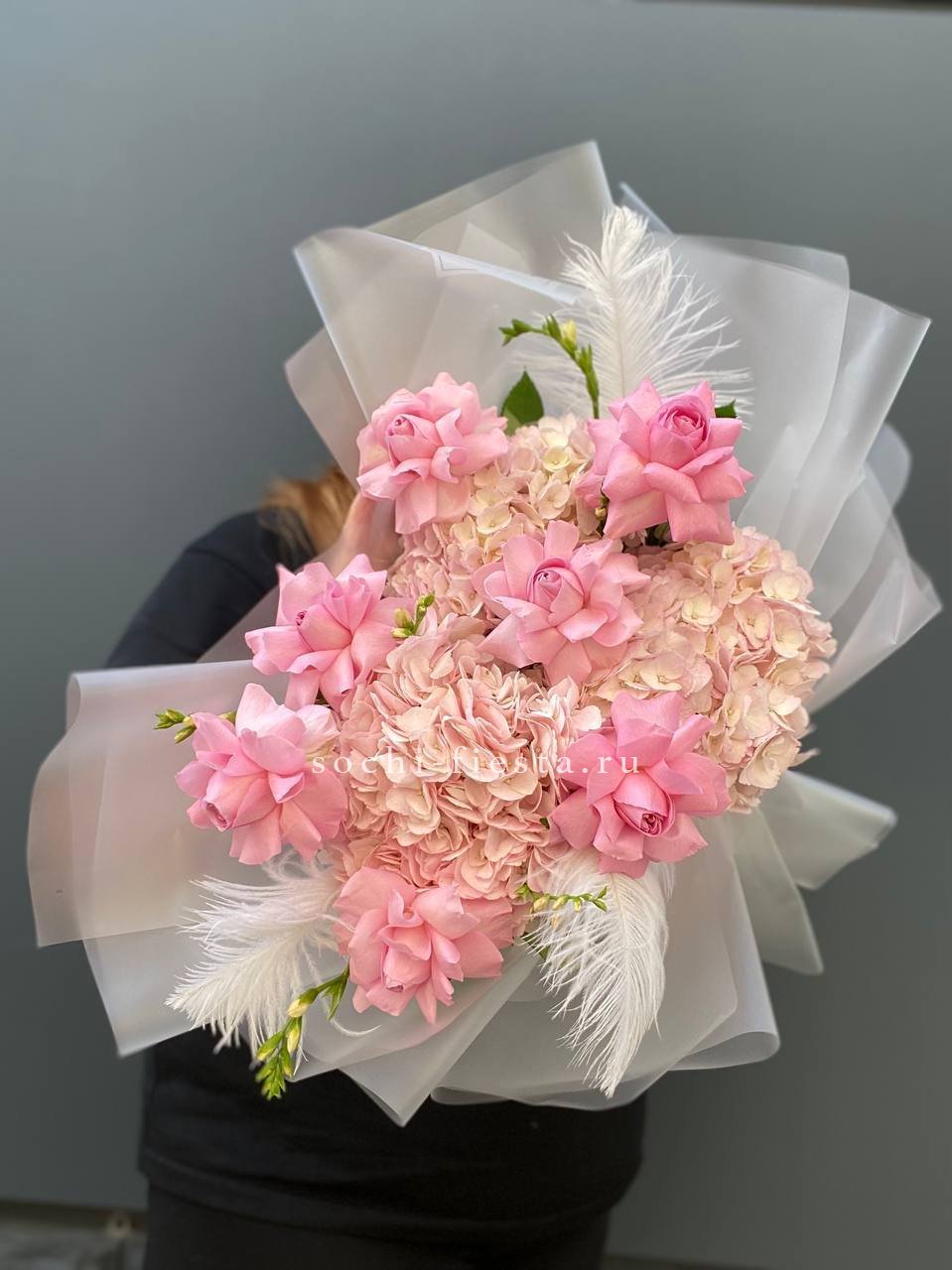 гортензия, диантус, хризантема, эустома, розы, озатамус, пленка.