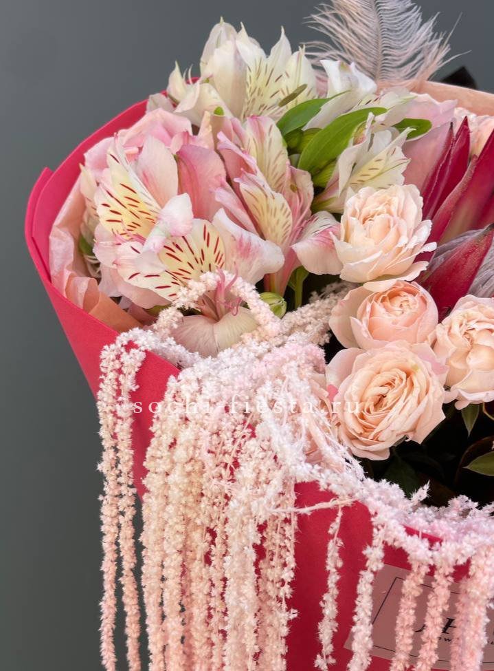 Красные и розовые оттенки переплетаются с цветущими ветками и пушистым лагурусом. Аспарагус добавляет воздушности, а кустовые розы заполняют пространство живой энергией. Букет держит форму и притягивает взгляд.