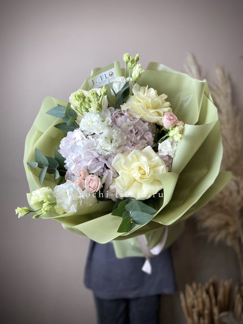 гортензия, французские розы, маттиола, лимониум, дианстусы, эвкалипт, ковыль и дизайнерская упаковка.