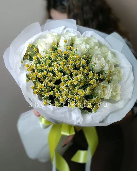 ромашки (танацетум камилла) , розы, лента, упаковка.