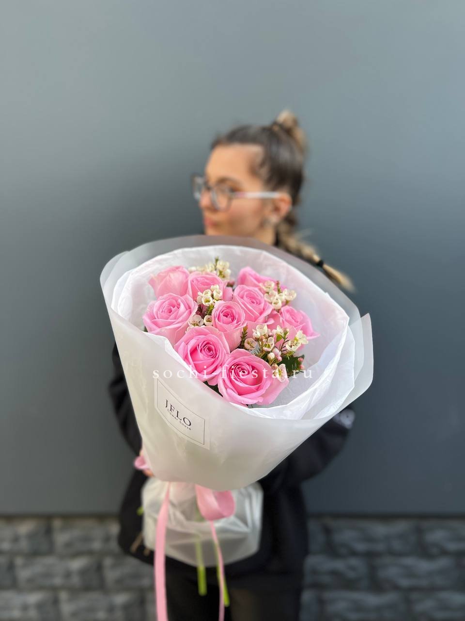 розовые розы, хамелациум (аналог),  лента, пленка, тишью.