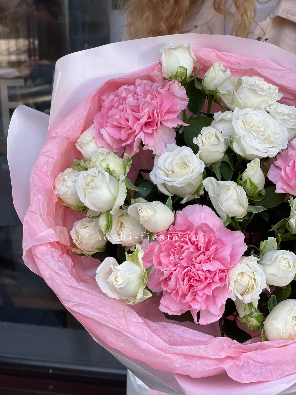 роза кустовая, диантус, лента, дизайнерская упаковка.