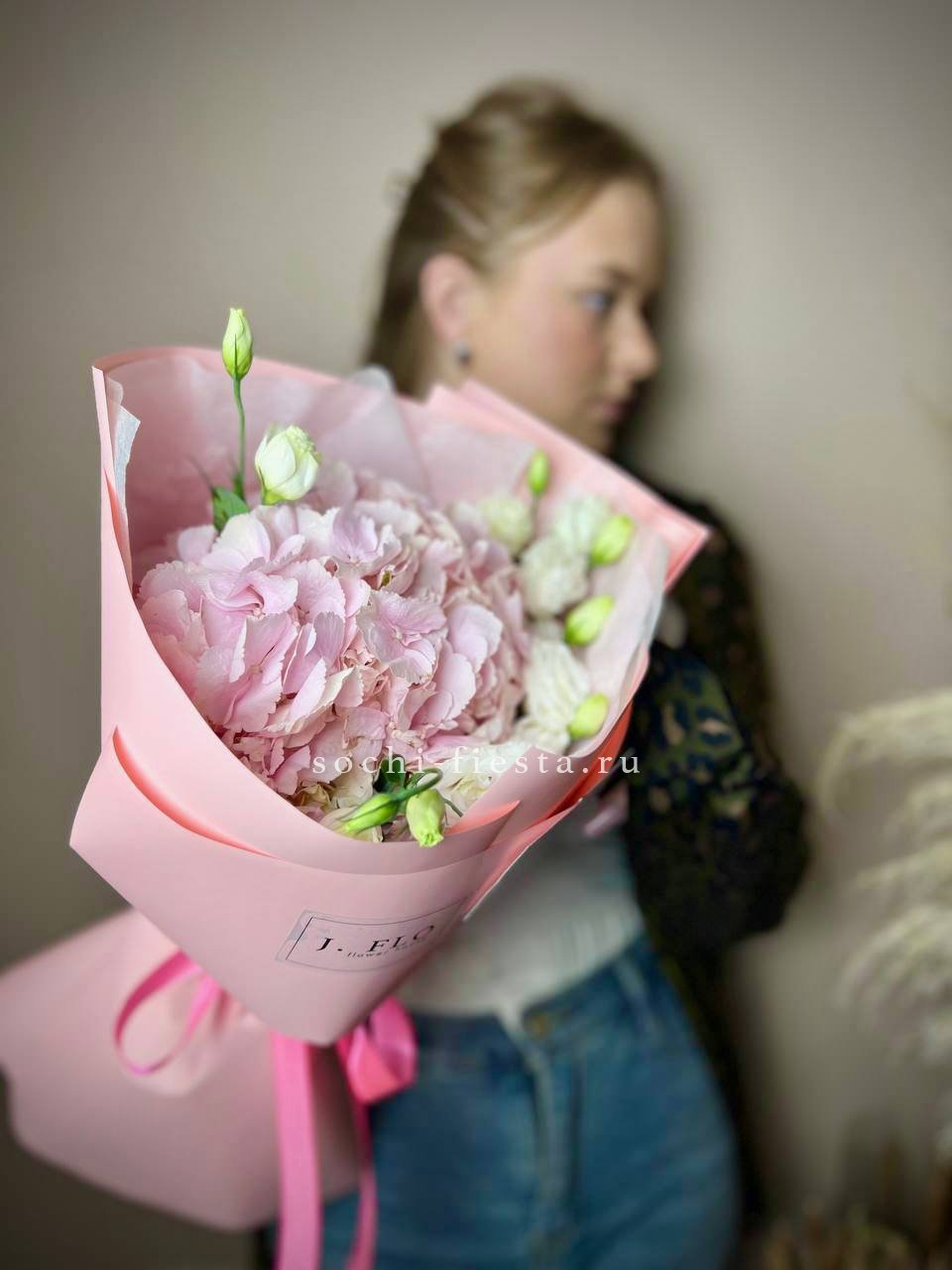 розовая гортензия, белые ирисы (или эустома), лента, дизайнерская упаковка.