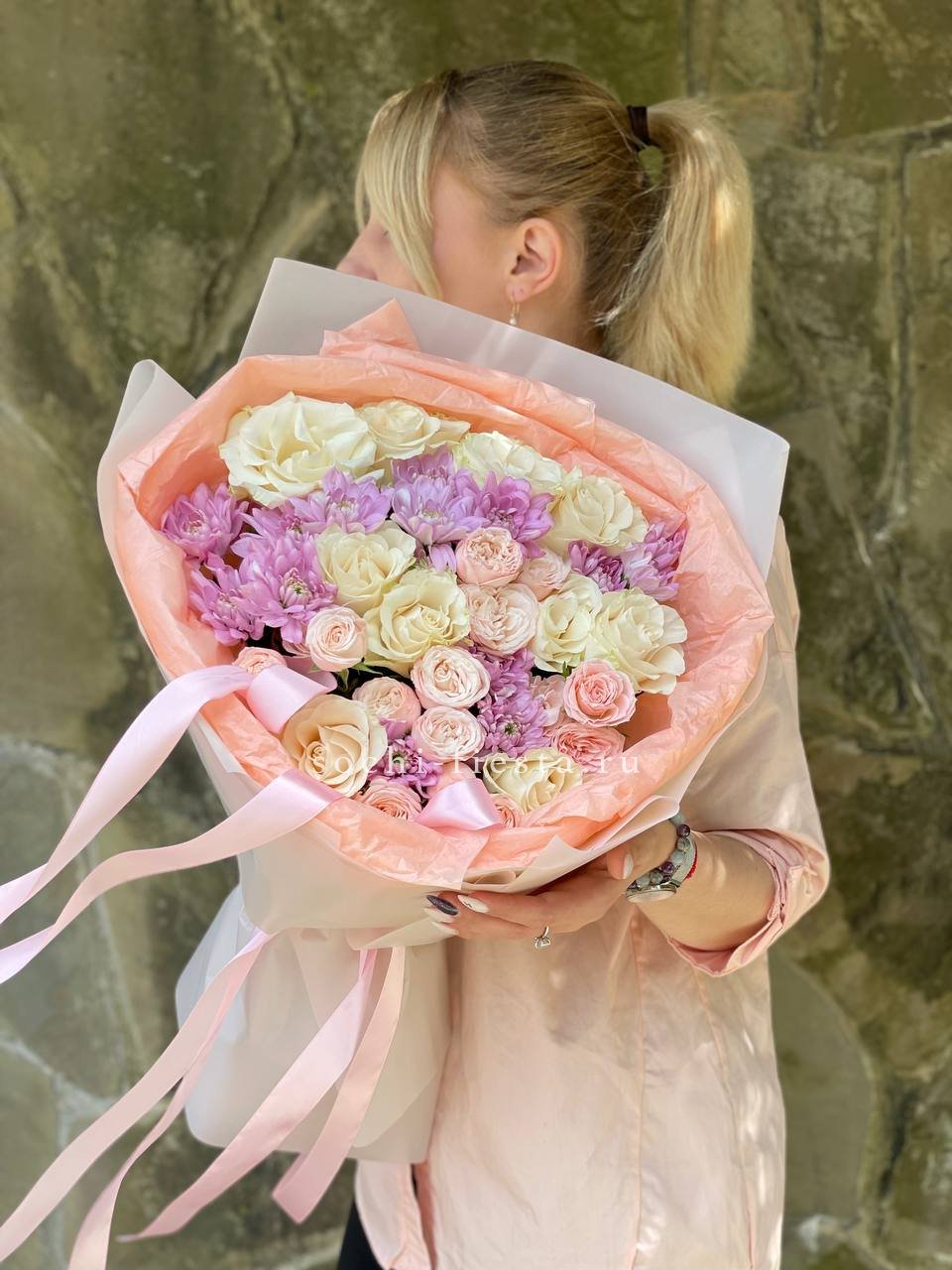 Lucrecia собрана из пионовидных и классических роз с добавлением пушистых кустовых хризантем. Букет легко впишется в современный интерьер и поддержит спокойную эстетику пространства.