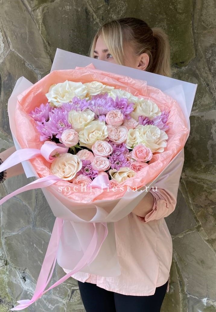 хризантемы кустовые, пионовидные розы, одноголовые розы, лента, дизайнерская упаковка.