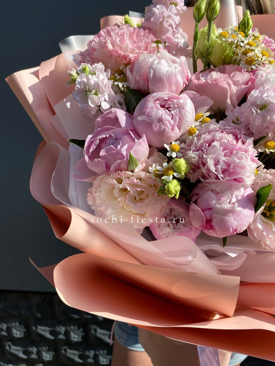 розовые пионы, эустома, ромашки, лента, дизайнерская упаковка.