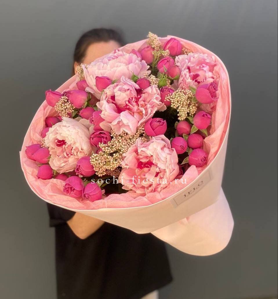 пионы, кустовые розы, озатамус , лента и дизайнерская пленка.