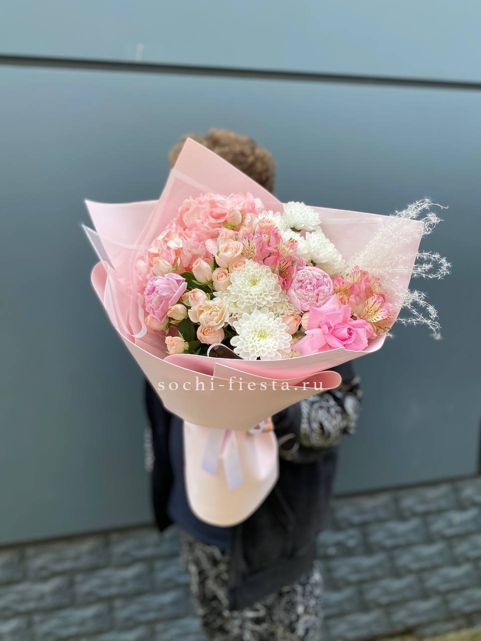 пионы, гортензии,розы кустовые,альстромерии,  лента и дизайнерская пленка.
