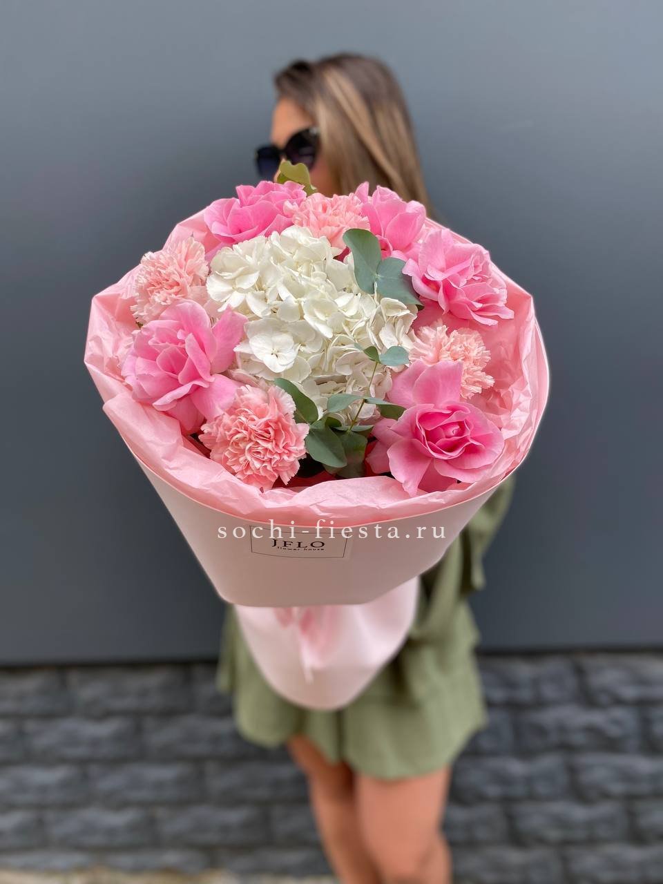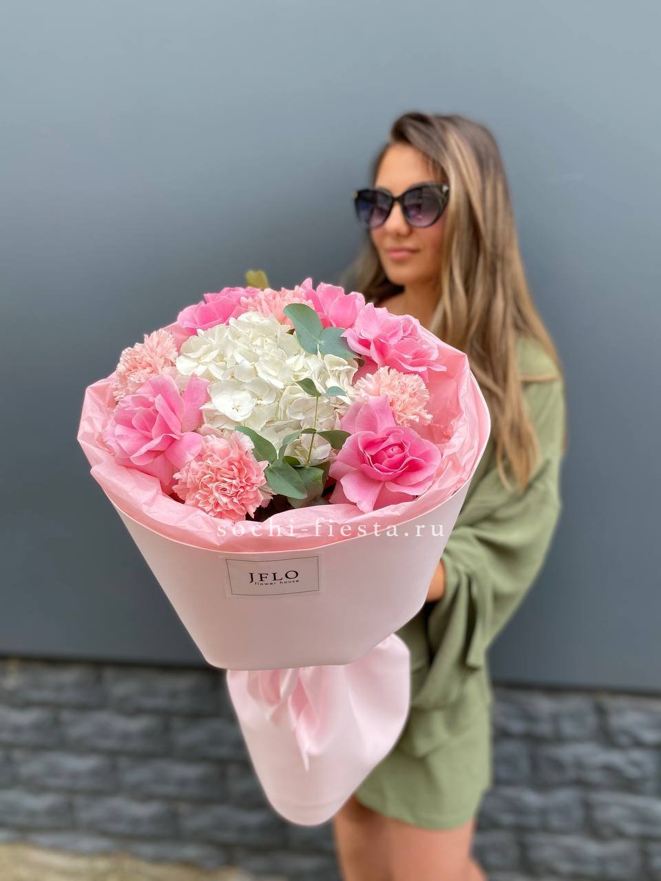 Яркая композиция собрана из гербер, роз Джумилия и воздушной гортензии. Диантус и озотамнус добавляют фактурности, создавая объёмный силуэт с живописной глубиной.