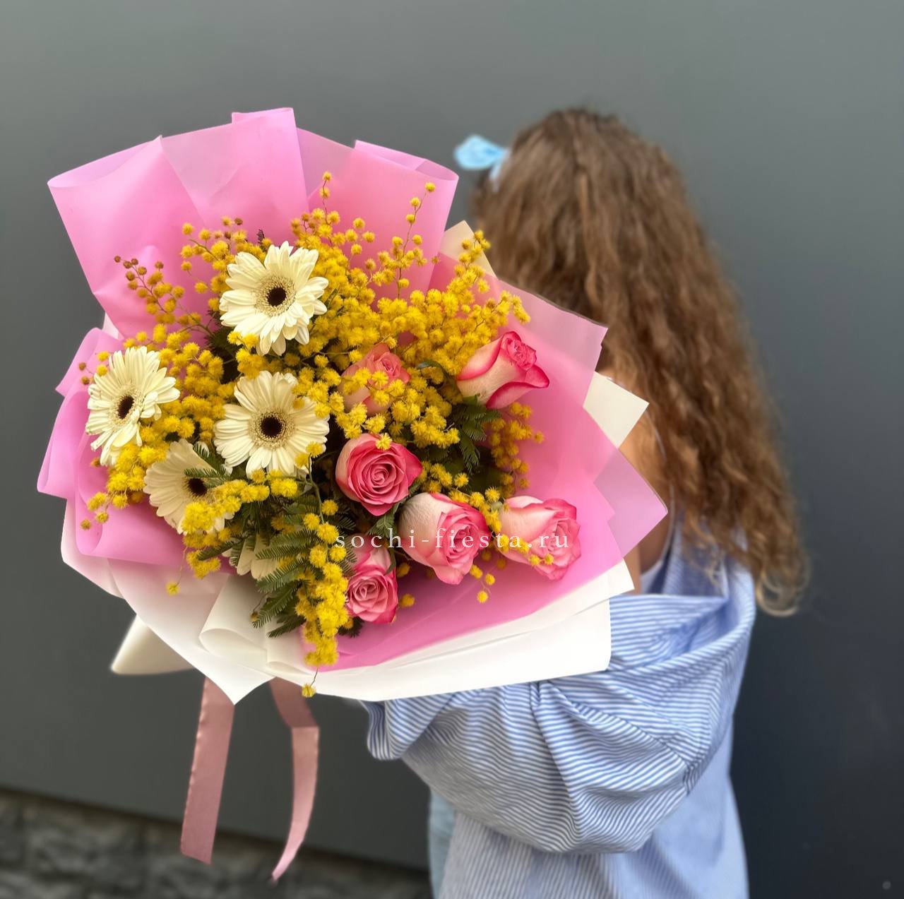 Солнечная мимоза встречается с яркими гербераами и розами Венди в жизнерадостной композиции. Тёплые оттенки создают весеннее настроение и дарят улыбку.