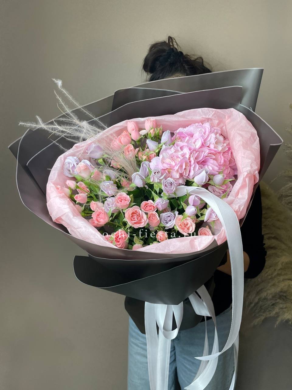 Герберы и гортензия создают воздушную композицию с лёгким ритмом и плавными переходами. Бомбамстик добавляет графики, а диантус смягчает общую форму.
