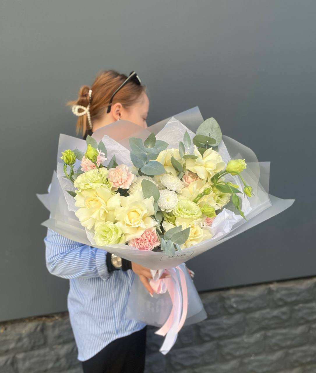 Белые розы и эустома образуют мягкую светлую основу, которая успокаивает взгляд. Диантус и хризантема наполняют букет объёмом, а эвкалипт вносит природную свежесть.
