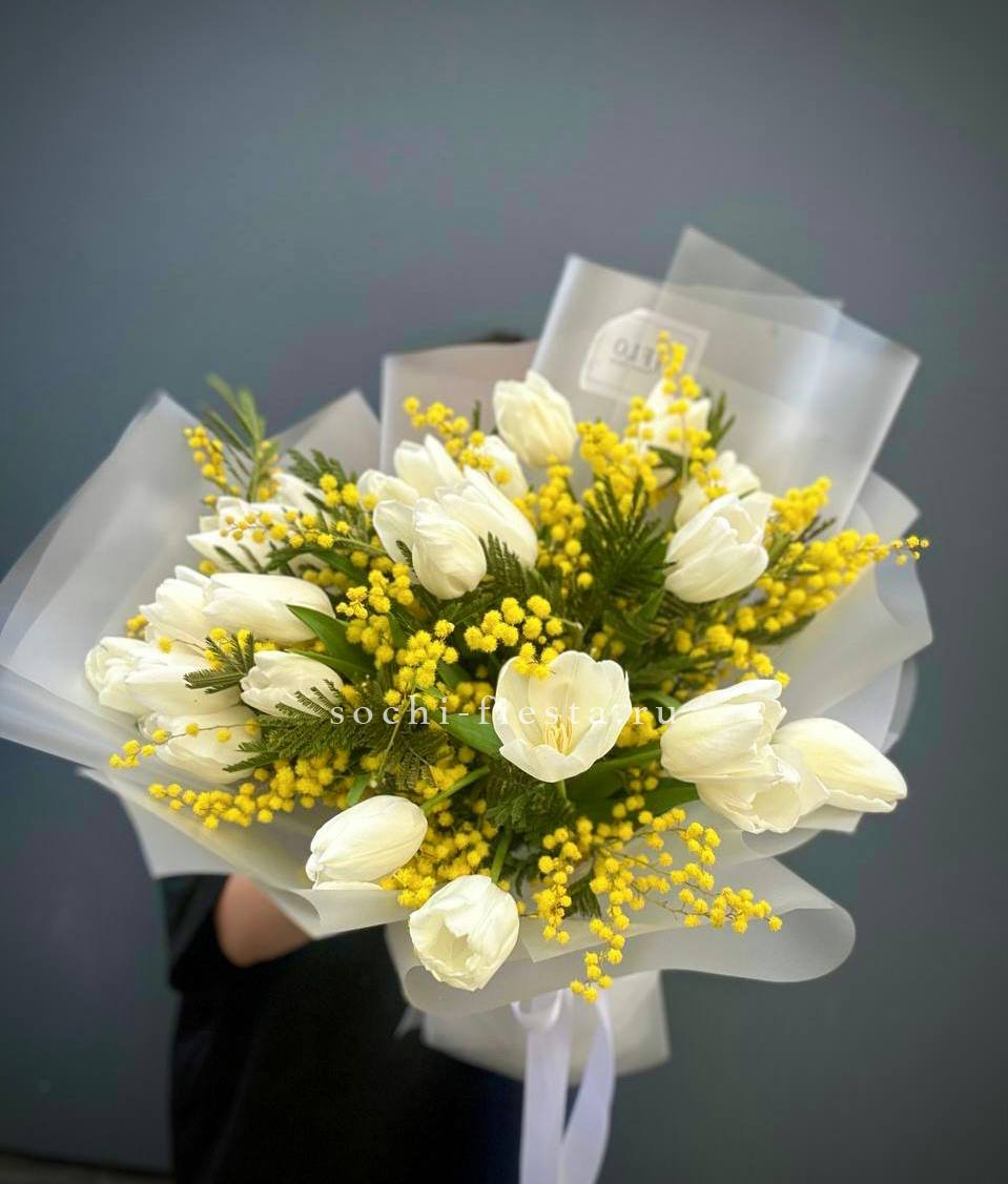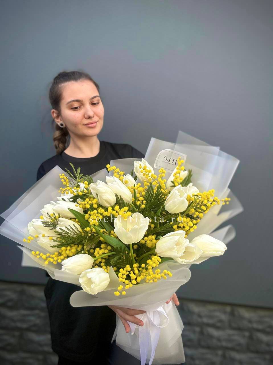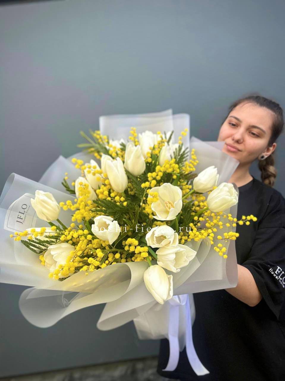 Двадцать пять тюльпанов встречаются с солнечной мимозой в весеннем дуэте. Букет держит форму и радует глаз сочной зеленью стеблей. Это композиция для тех, кто ждал тепла и света.