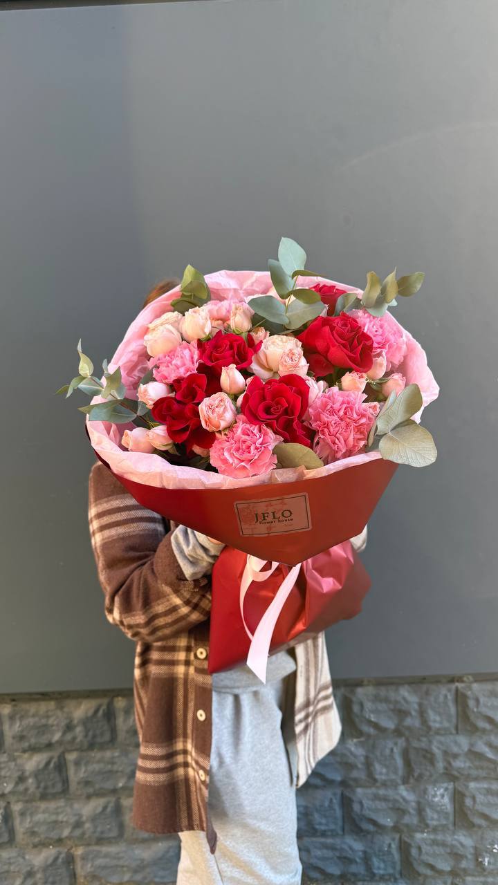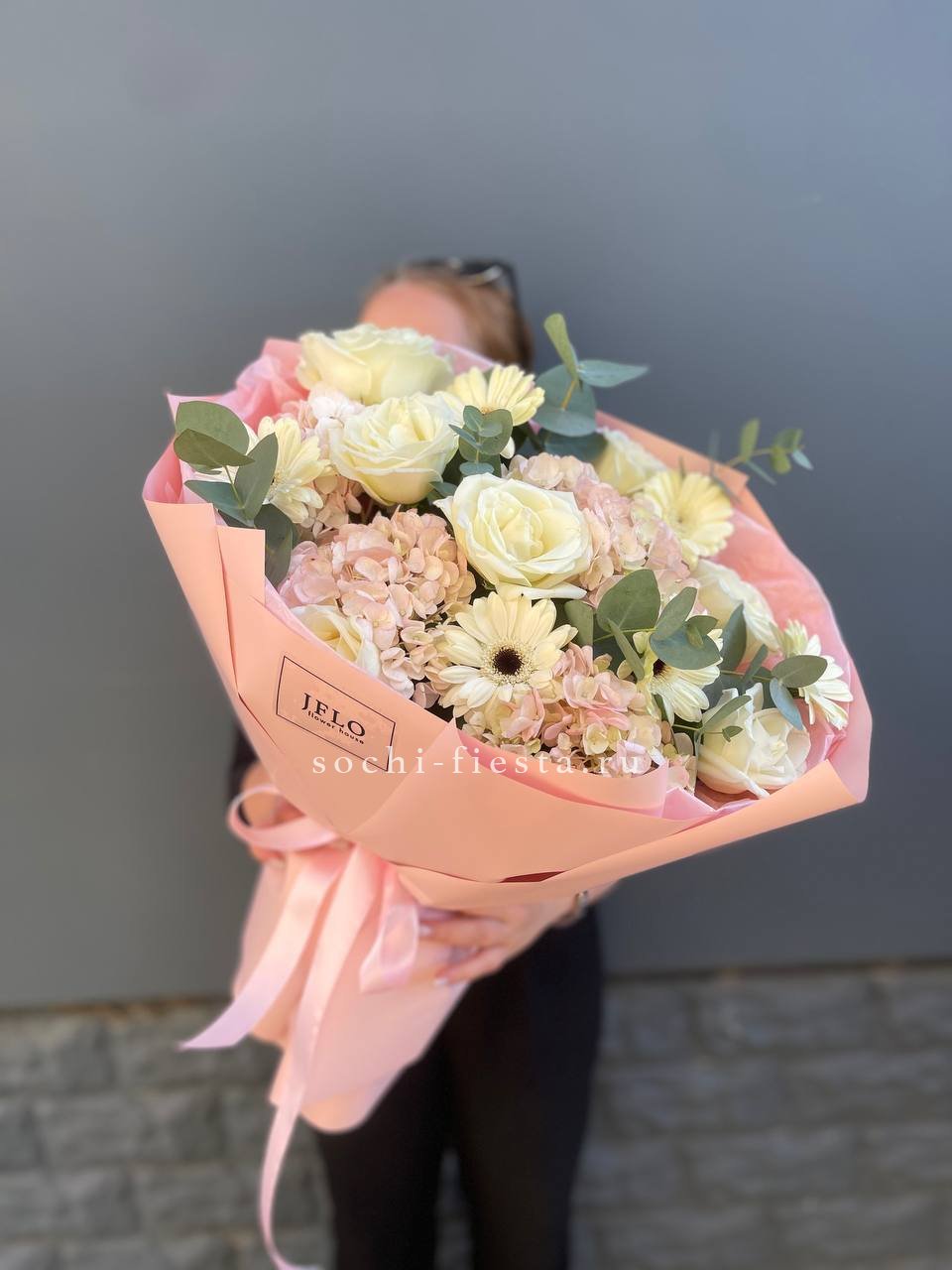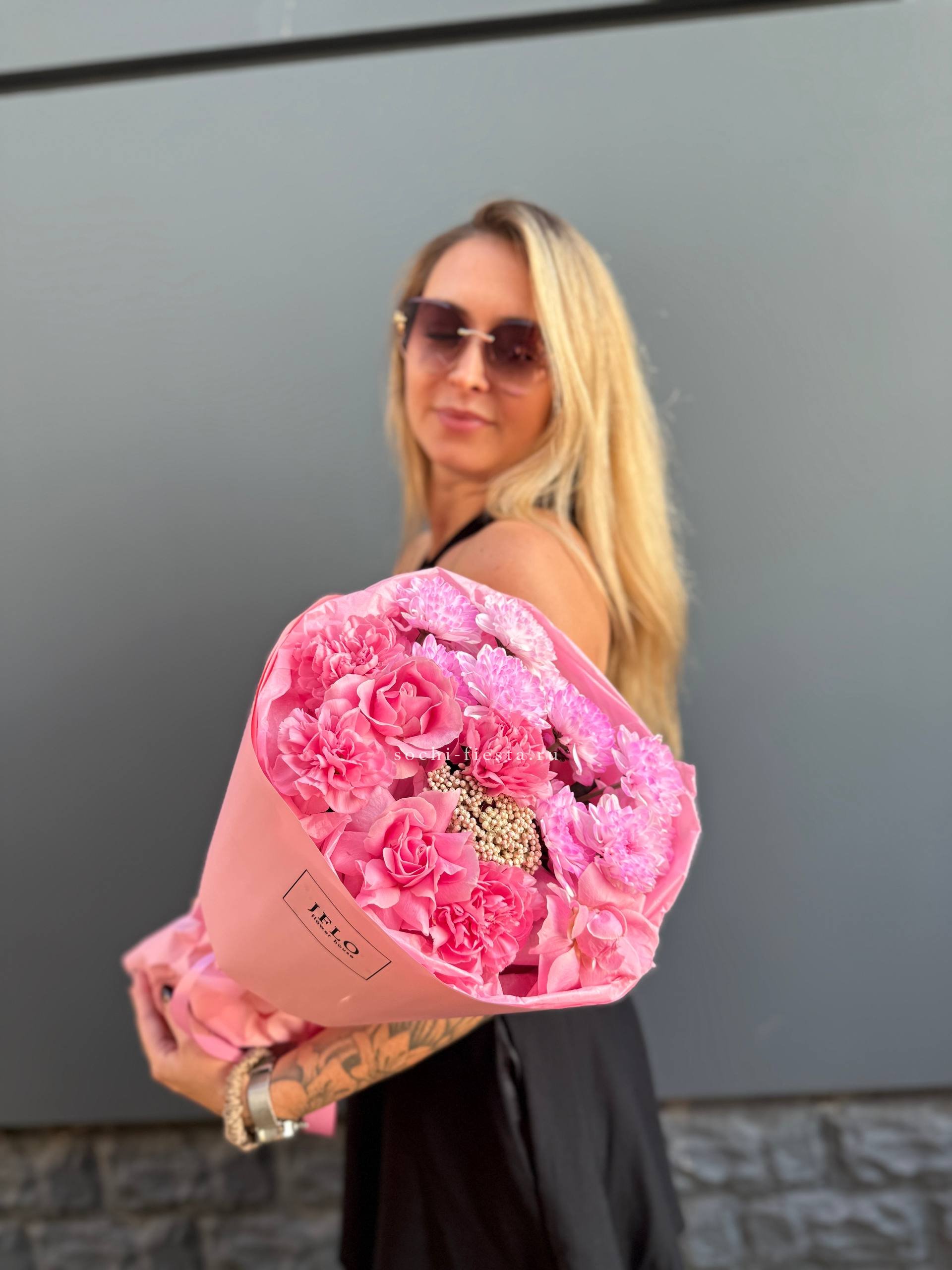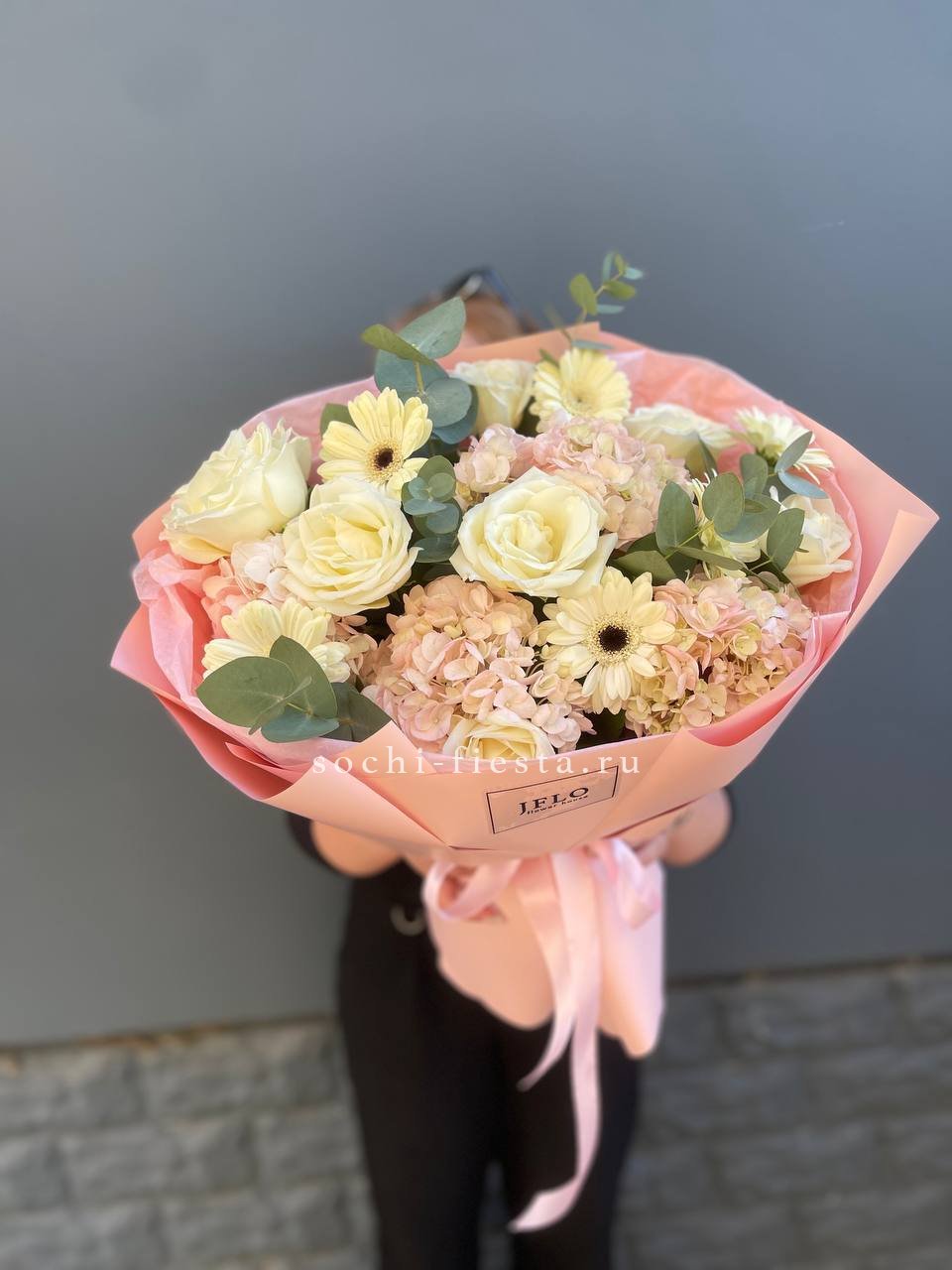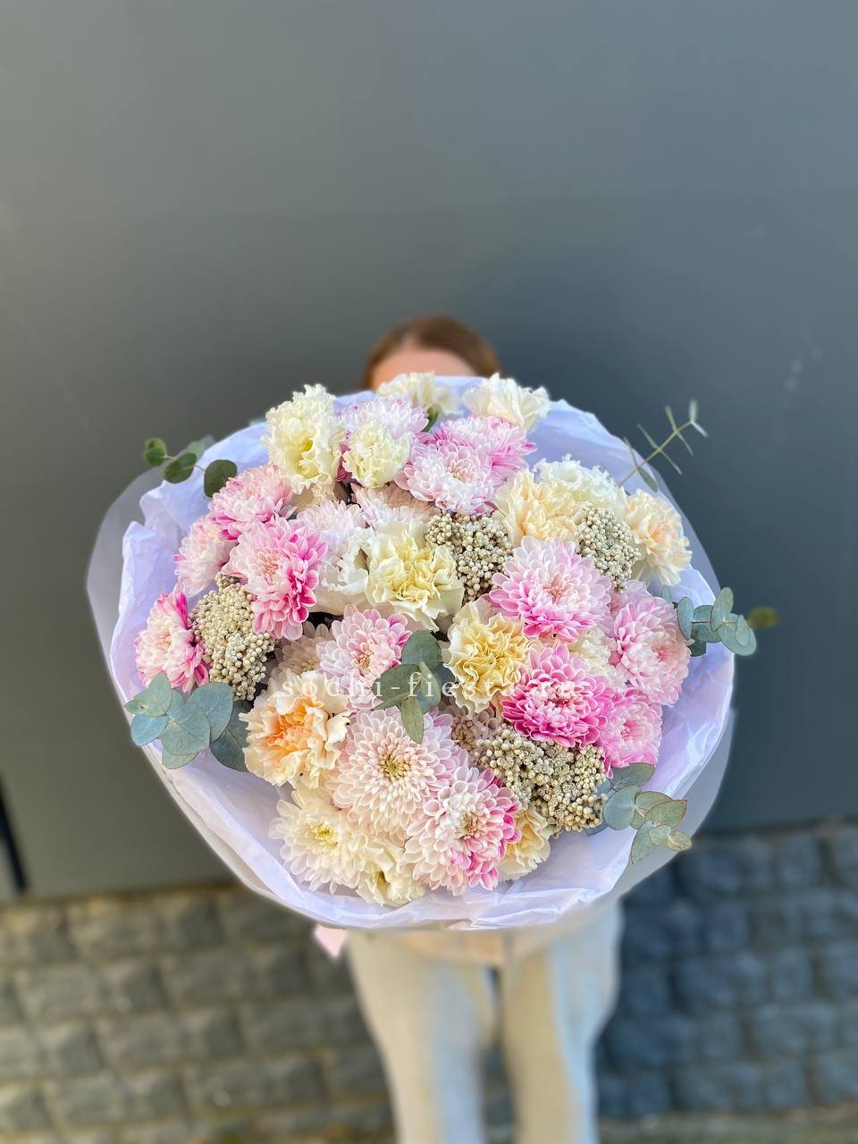 Диантусы и маттиола добавляют букету душистую лёгкость, а гортензия создаёт объёмную основу. Мисти баблс и эвкалипт рисуют воздушный контур вокруг розовых оттенков.