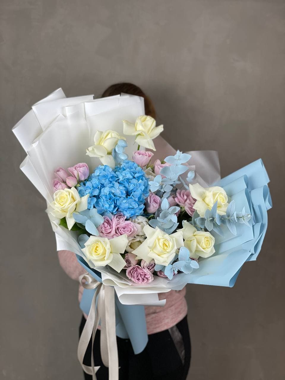 Прохладная палитра голубой гортензии и пионовидных роз в дизайнерском исполнении. Тюльпаны вносят весенний акцент, а эвкалипт завершает композицию мягкими линиями.