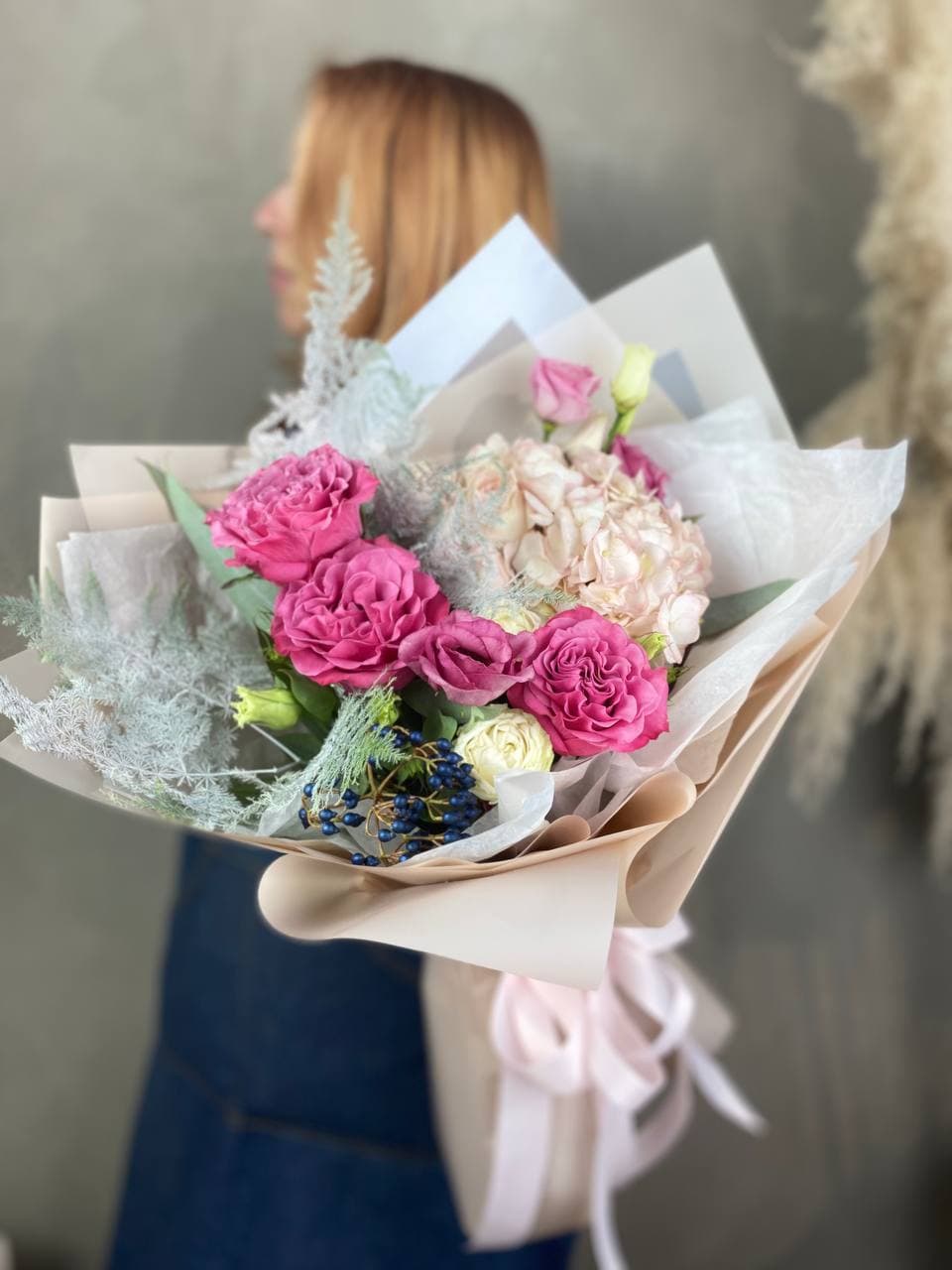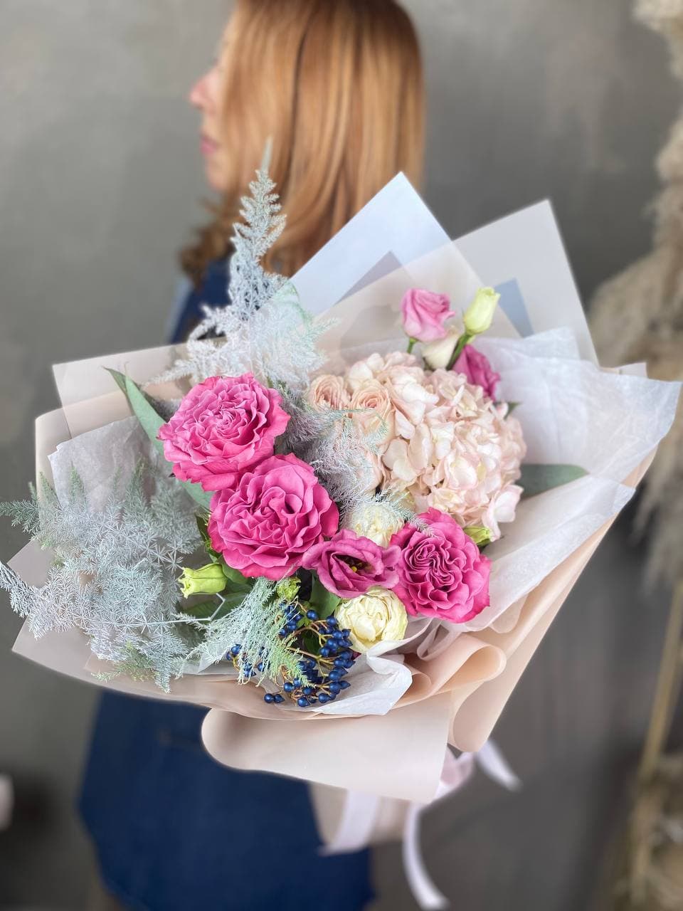Крупные шапки гортензии задают объем, а пионовидные розы добавляют глубину за счет многослойных лепестков. Эустома вносит легкость, а перистый аспарагус разбивает плотность цветочной массы.