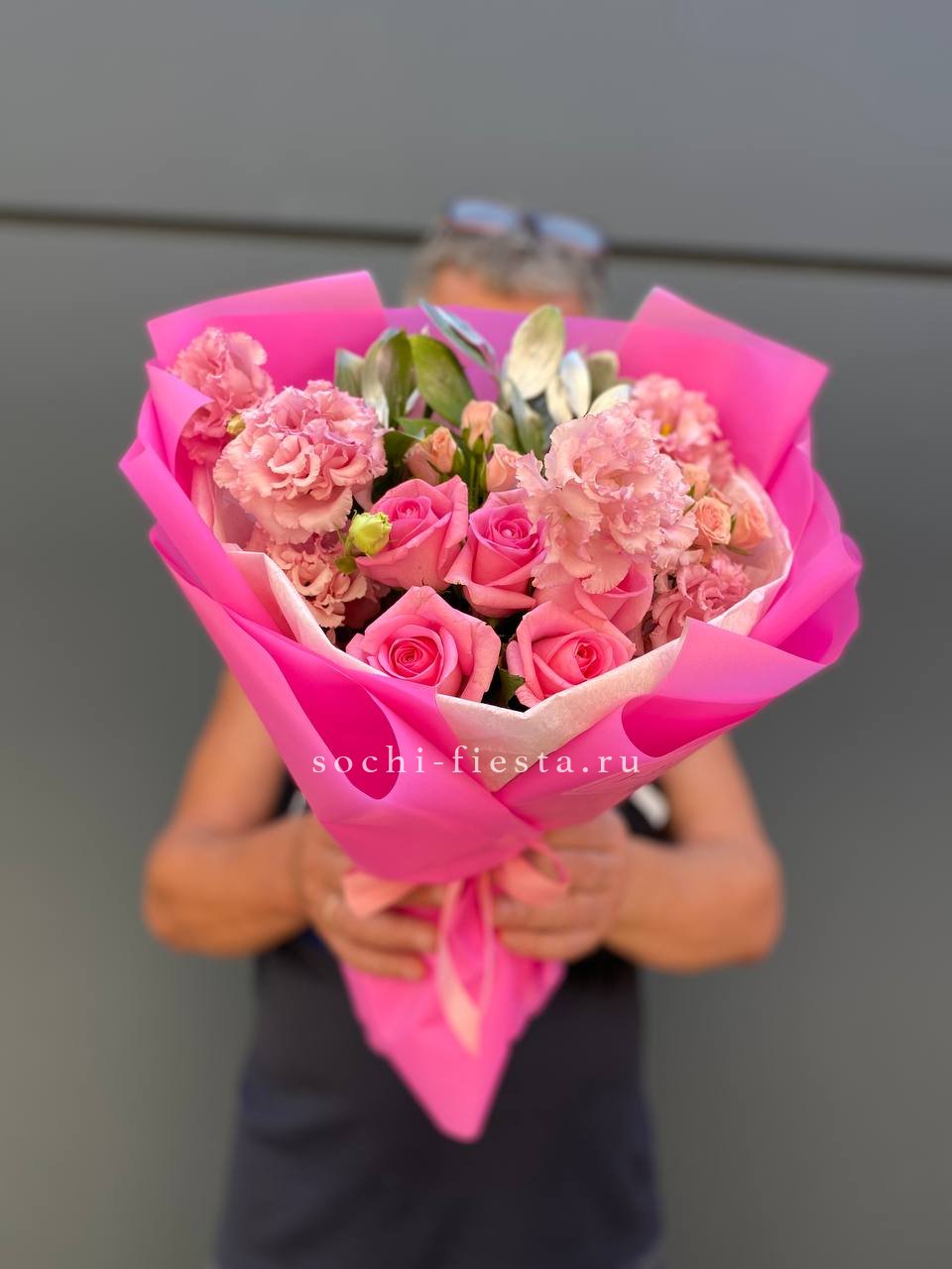 гортензия, гвоздика, статица (или аналог), роза, эустома, дизайнерская пленка, лента.