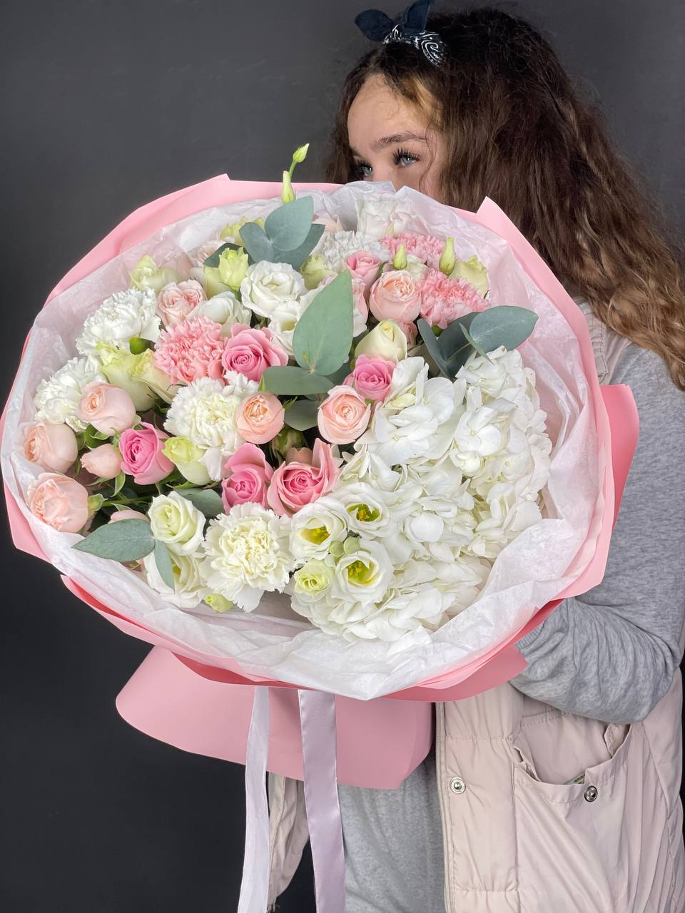 Пышная шапка из роз двух оттенков с объёмной гортензией и воздушным диантусом создаёт мягкий переход от белого к розовому. Бомбастик добавляет букету плотности, а эвкалипт освежает общую композицию. Универсальное решение для яркого поздравления.