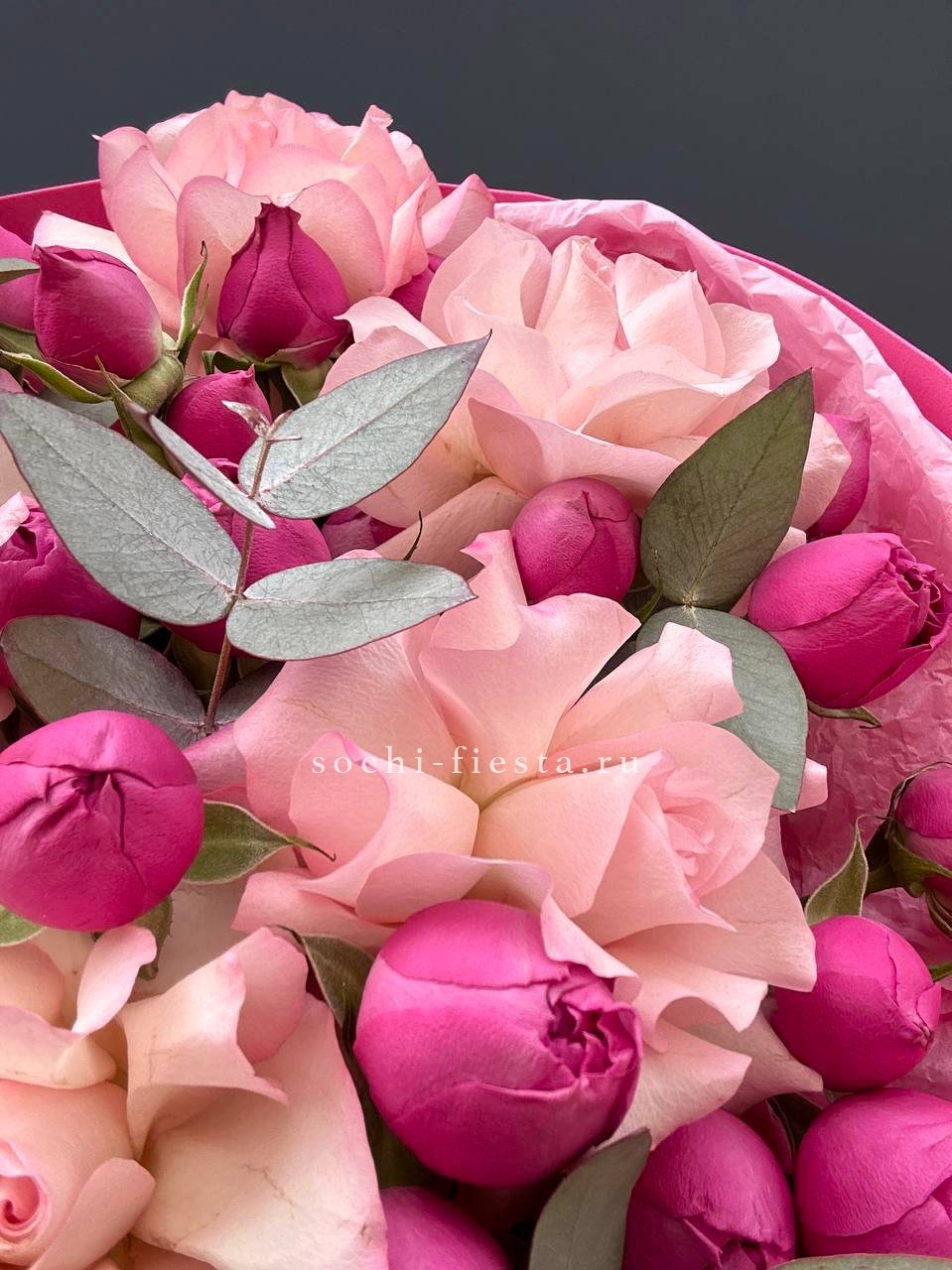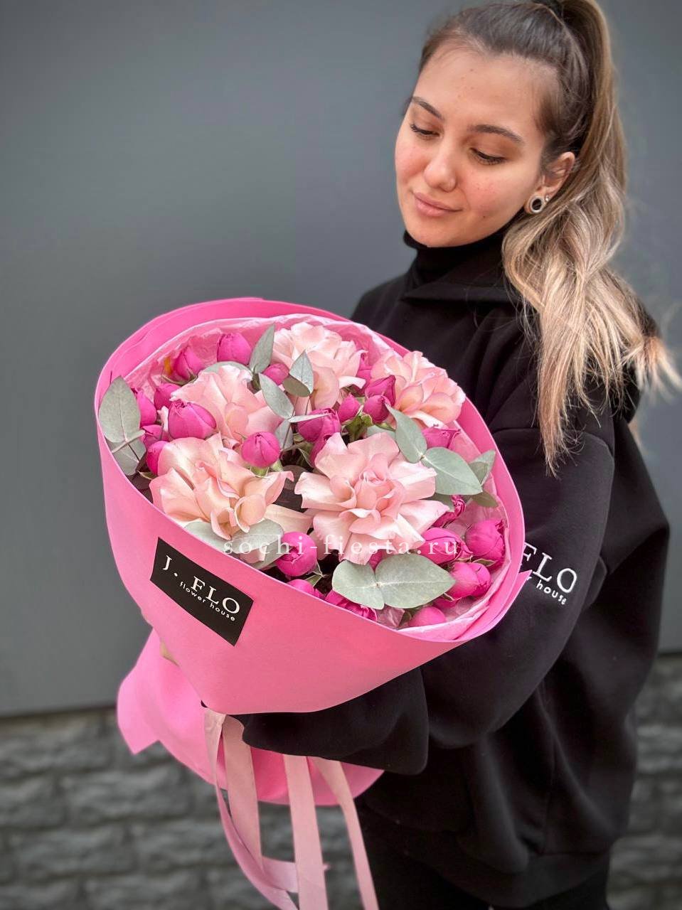 розовые розы, белые розы, диантус, бомбастик, гортензия, эвкалипт, пленка.