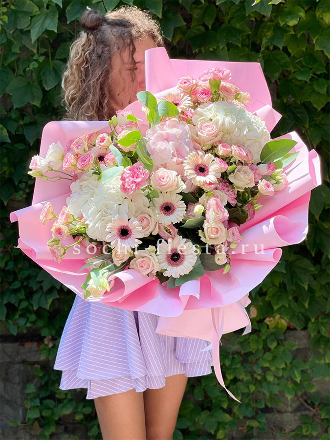 гортензия, гербера, диантус, эустома, свит ревиваль, кустовая роза, эвкалипт, лента, корейская пленка.